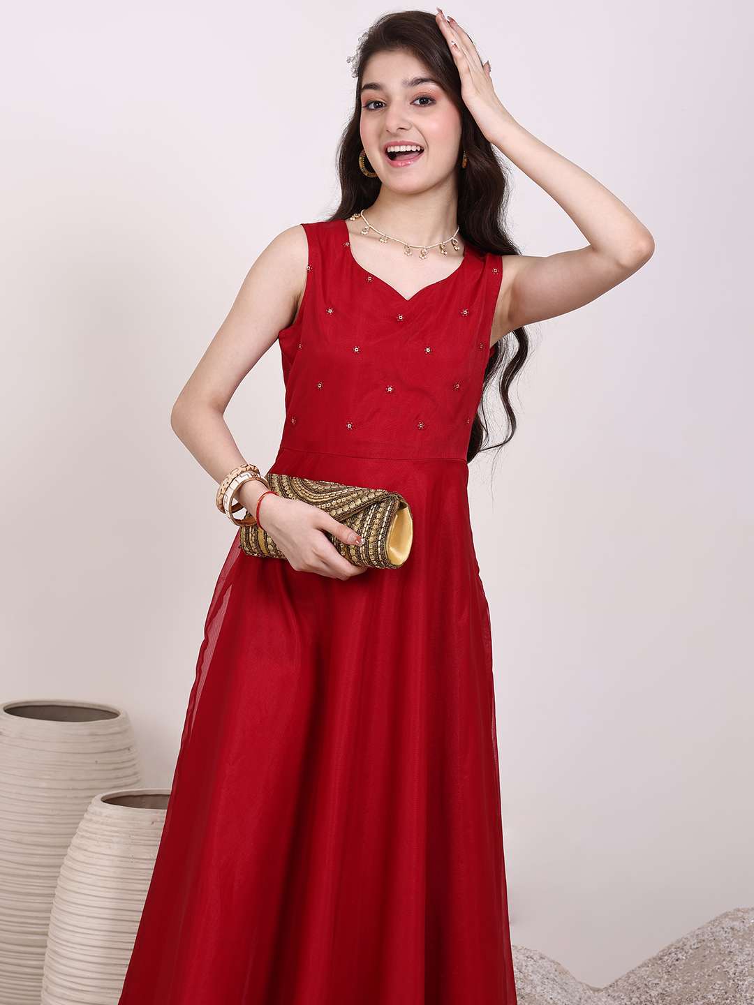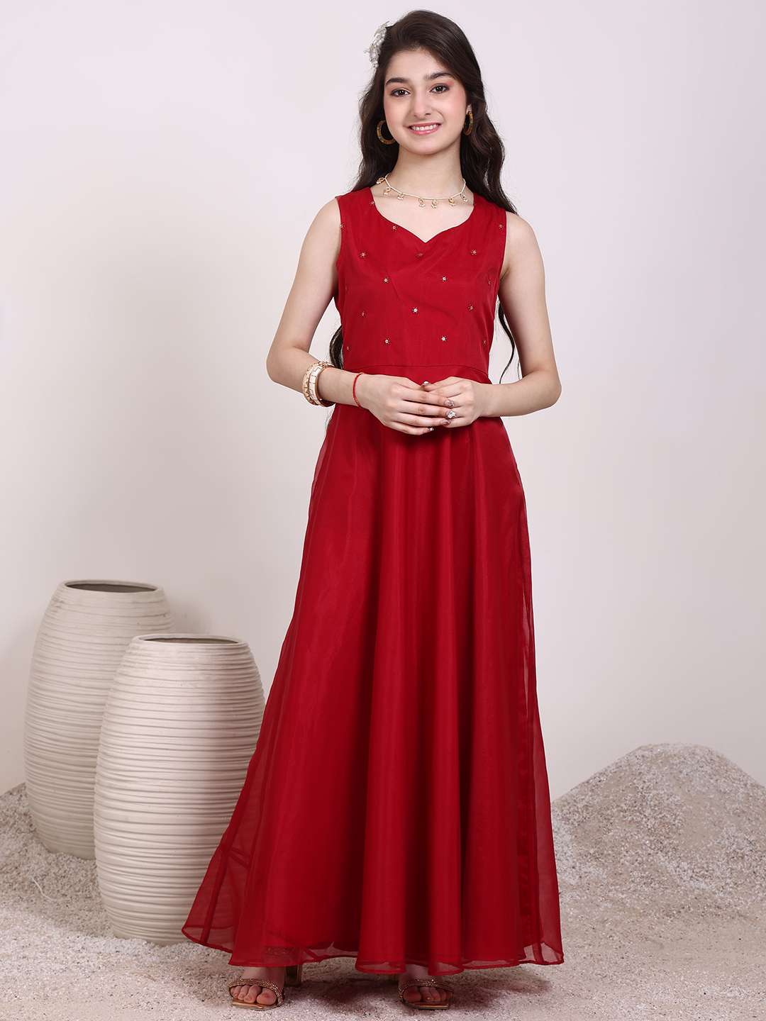 Dress up your little girl in our Girls Sequinned Embellished Ethnic Maxi Dress. Perfect for any special occasion, this maroon dress features elegant sequinned embroidery, a sweetheart neckline, and a fit and flare silhouette. Sleeveless with a flared hem and slip-on closure for easy wear. Material & Care Polyester Dry Clean