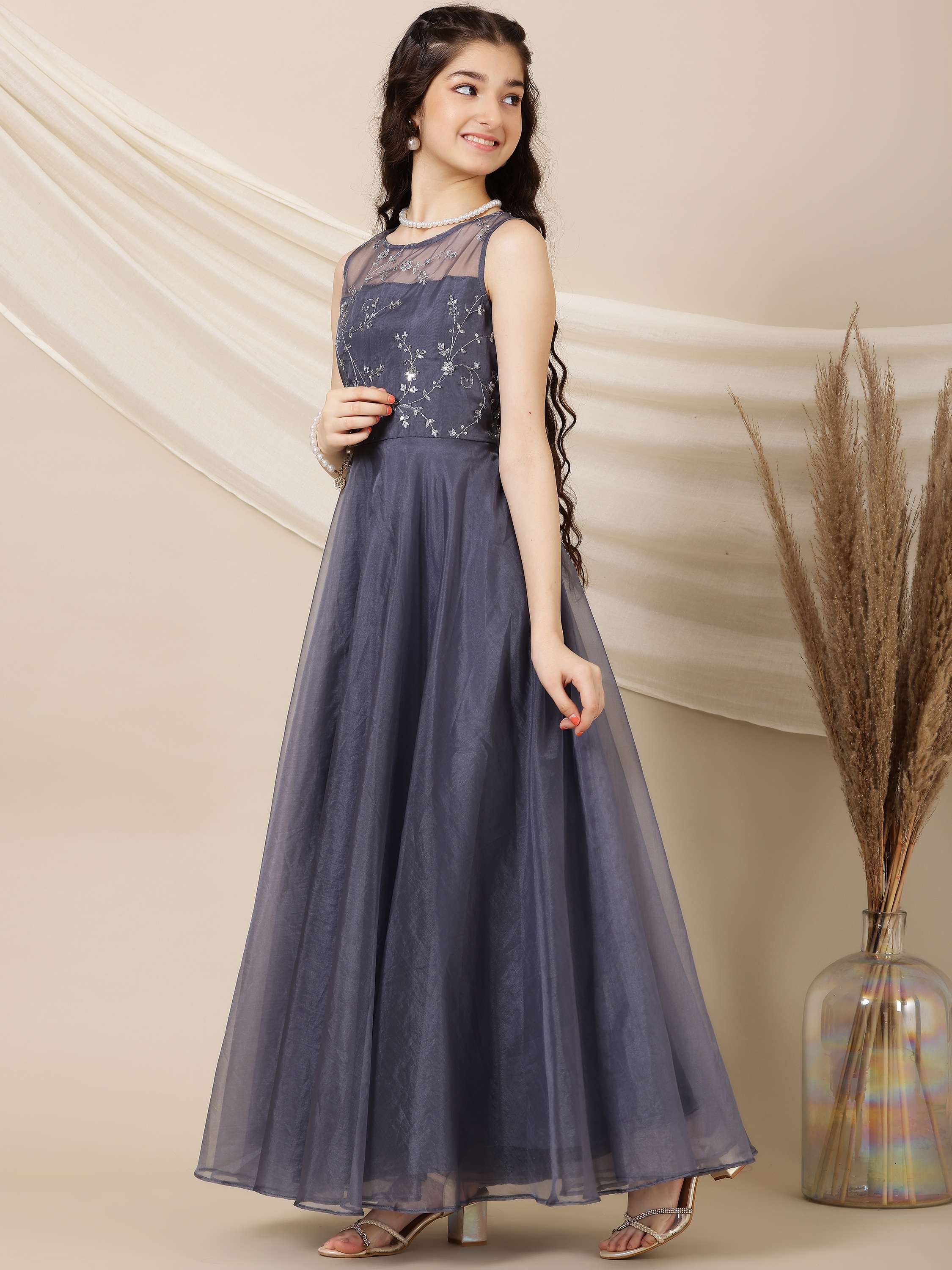 Expertly crafted in an elegant grey hue, these Girls Thread and Sequinned Embroidered A-Line Ethnic Dresses feature a stunning combination of thread and sequin embroidery. The A-line shape flatters any figure while the round neck and sleeveless design add a touch of sophistication. Perfect for any occasion, these dresses are a must-have for your little fashionista's wardrobe.