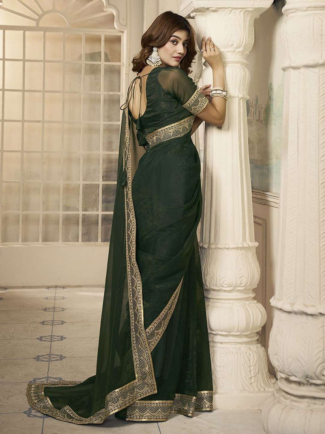 This stunning Green and Gold-Toned Sequinned Embroidered Bordered Saree effortlessly combines elegance and style. The solid saree features delicate embroidery along the border and intricate sequin detailing. The saree also includes an unstitched blouse piece for a complete and customizable look. Don't just take our word for it, check out the image of the blouse piece to see the gorgeous design for yourself.