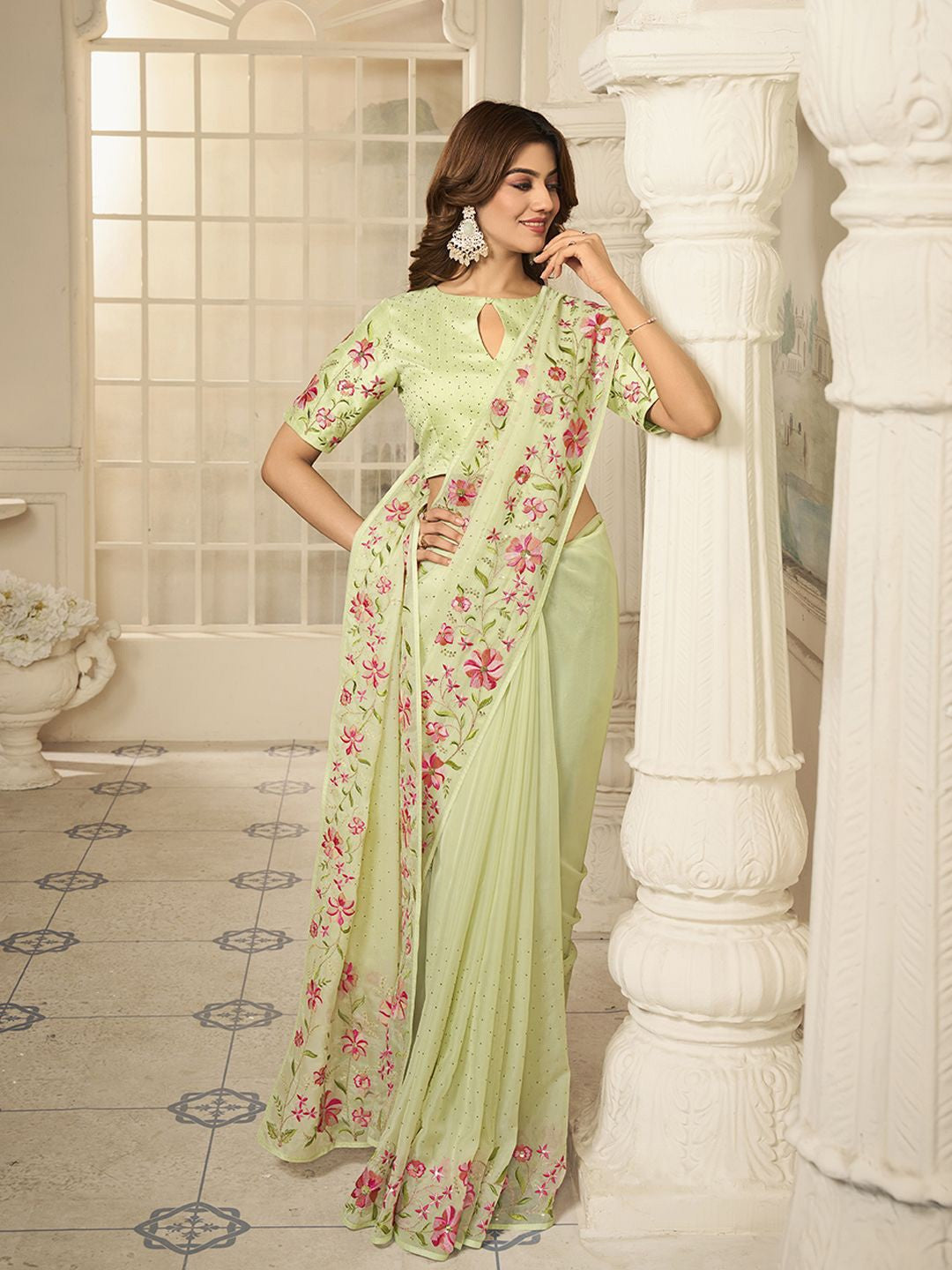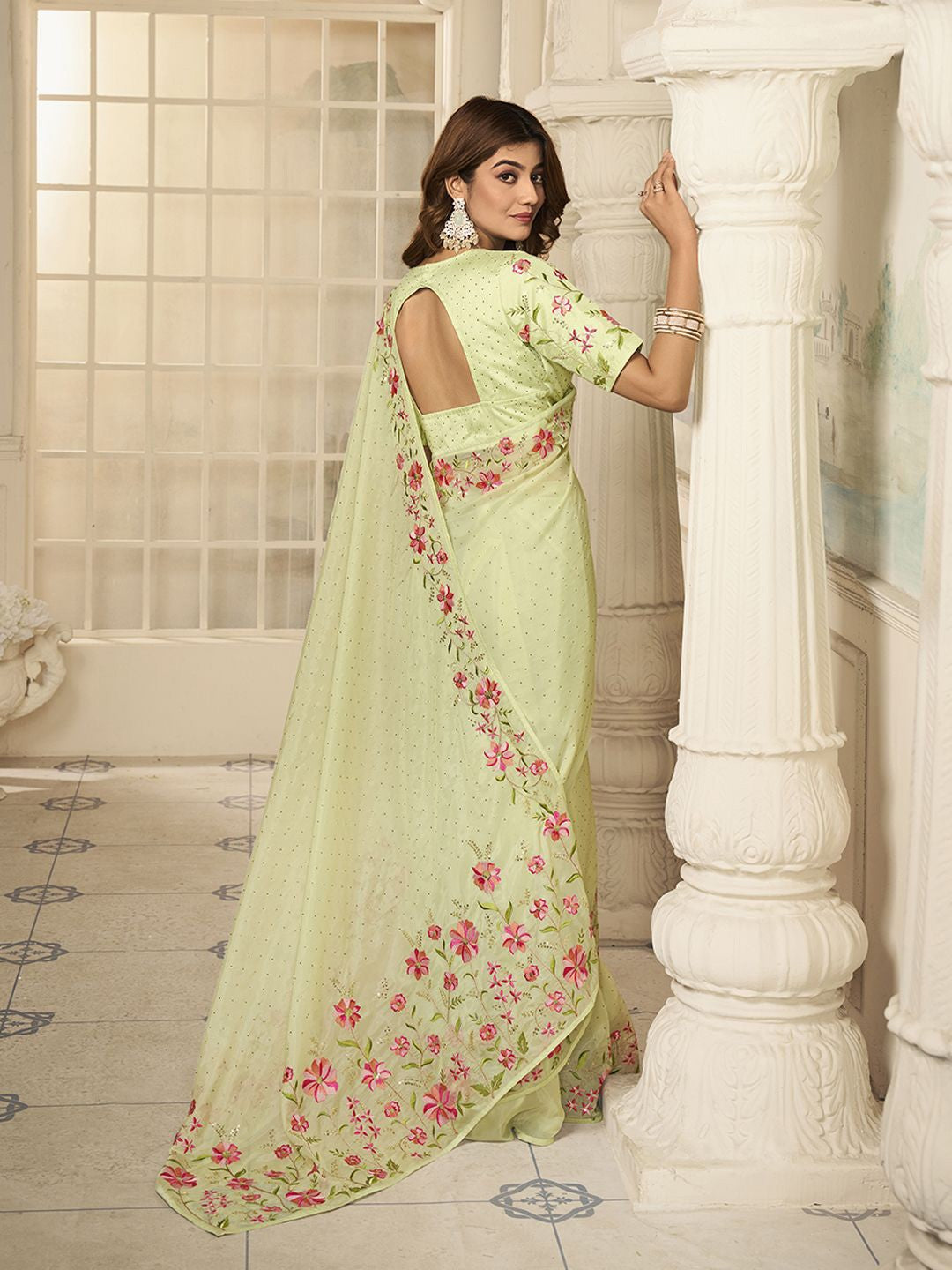 This green and pink saree features a beautiful floral print and embroidered border, accented with delicate sequin detailing. Made of organza, it is lightweight yet heavy in work, offering both style and comfort. The unstitched blouse piece allows for customization. Perfect for any special occasion.
