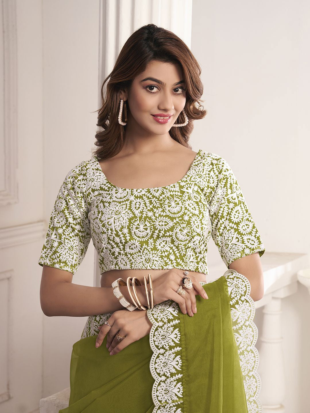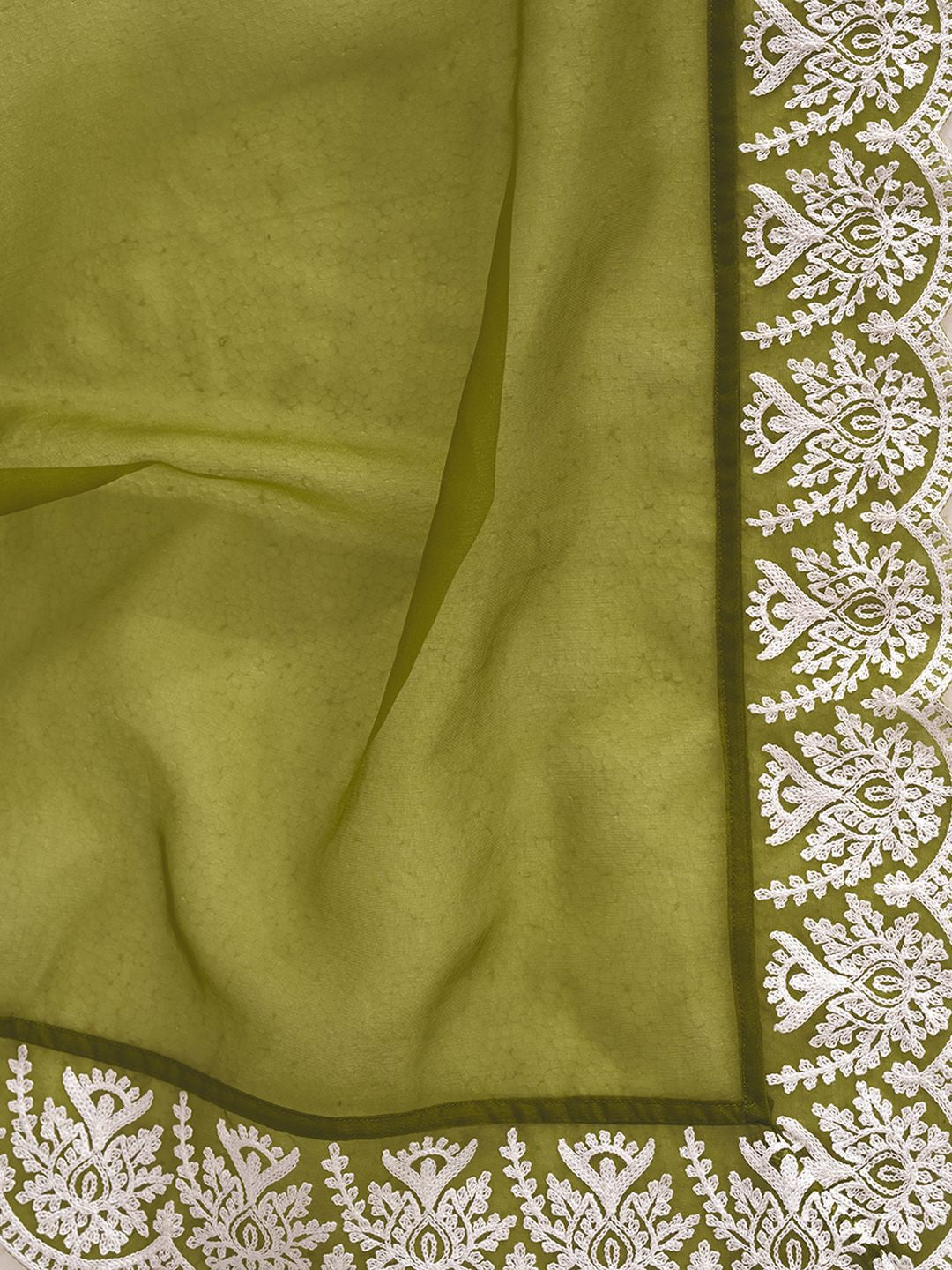 This Green And White Embroidered Organza Saree features a beautiful floral pattern and delicate embroidery on the border, adding an elegant touch to your wardrobe. Made from high-quality organza fabric, it comes with an unstitched blouse piece, allowing you to customize your look. Dress to impress in this timeless saree.