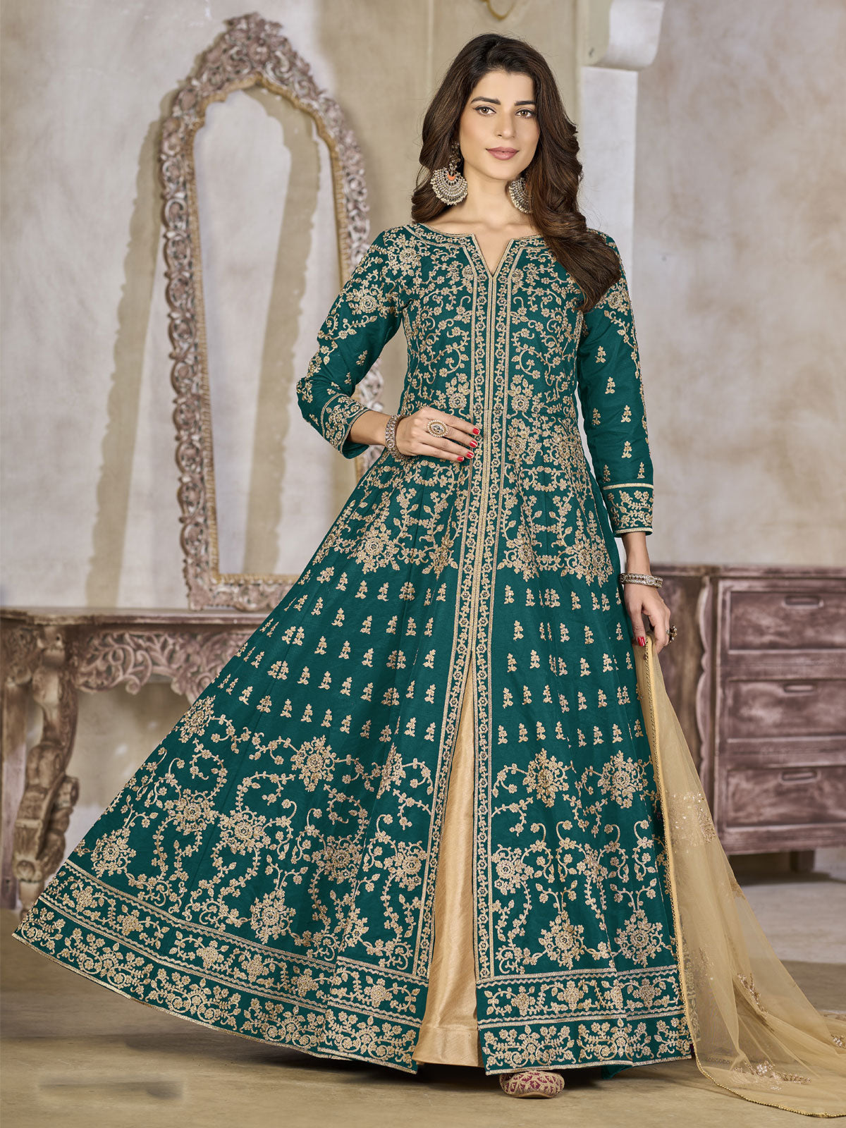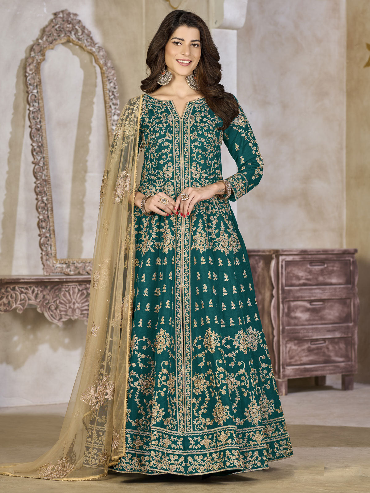 Elevate your festive wardrobe with this Green Art Silk Slit Lehenga Style Anarkali Suit by Inddus. Crafted from premium art silk, this designer ensemble showcases intricate zari and sequin embroidery that radiates sophistication and timeless elegance. The graceful slit design and flowing silhouette create a striking presence, while the coordinated lehenga bottom and embroidered net dupatta ensure a polished, cohesive look. Perfect for weddings, celebrations, and special occasions, this piece seamlessly merges traditional handcrafted artistry with contemporary design sensibilities.