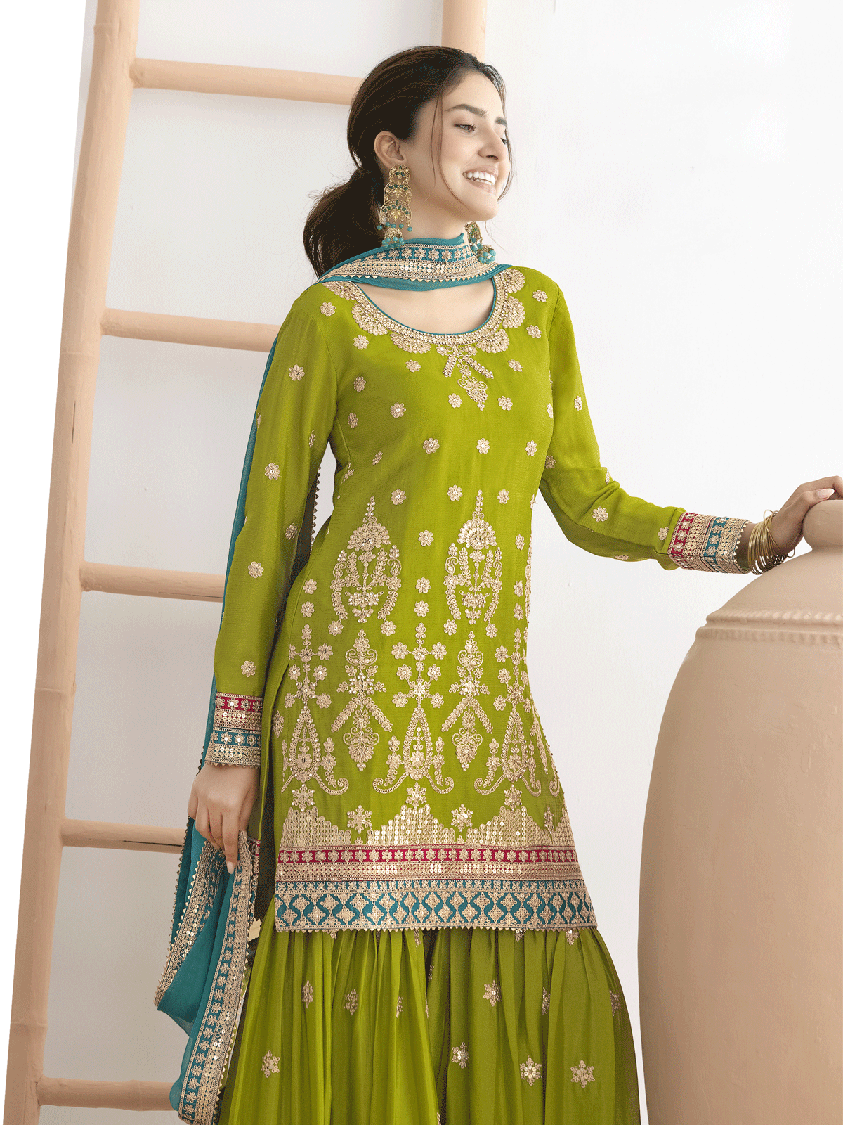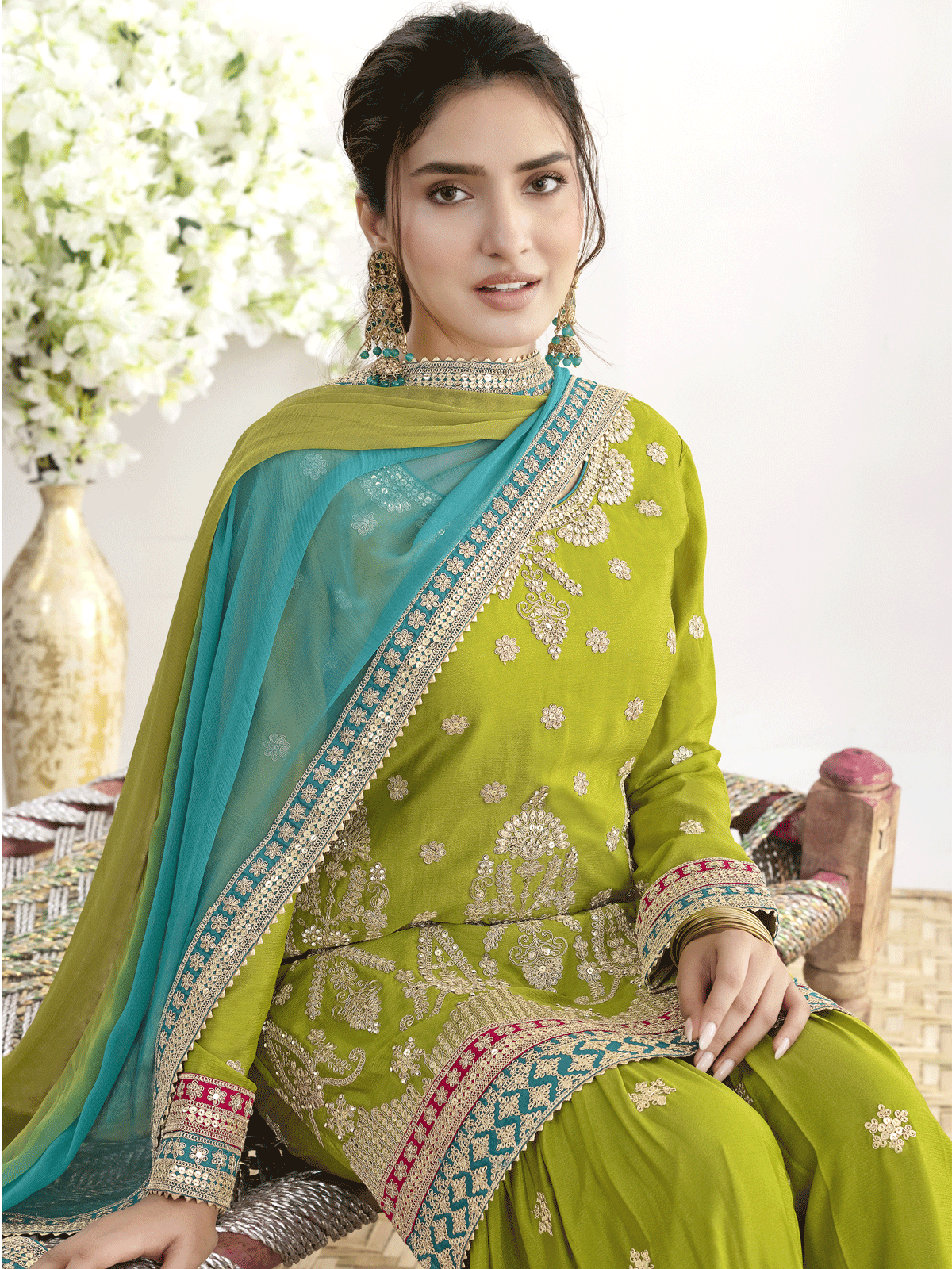 Elevate your ethnic wardrobe with this exquisite green gharara suit, meticulously crafted from premium chinnon silk. The rich emerald tone is adorned with intricate dabka dori embroidery, shimmering sequins, and refined hand work that showcase traditional artistry at its finest. This complete ensemble features beautifully embroidered gharara bottoms that complement the kurta perfectly, paired with a striking dual-tone dupatta finished with elegant 4-side lace embroidered borders. Ideal for weddings, celebrations, and special occasions, this piece combines timeless elegance with contemporary sophistication.