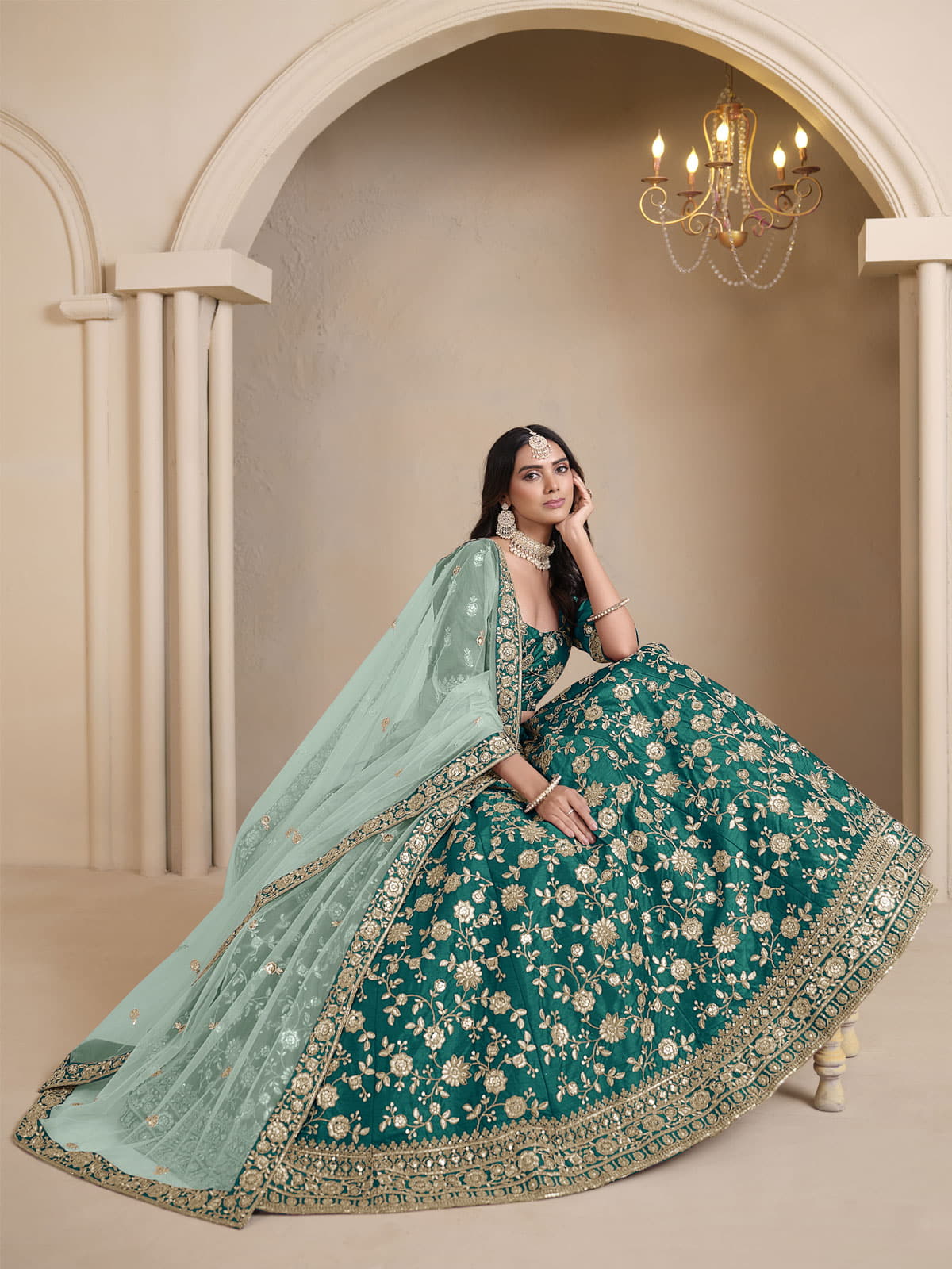Capture attention with this Green Bridesmaids Style Art Silk Wedding Lehenga Choli by Inddus. Crafted from premium art silk, it offers a luxurious drape and graceful movement. Intricate thread and sequin embroidery adorn the vibrant fabric, creating an elegant and detailed pattern. The ensemble includes a matching embroidered blouse and a delicate net dupatta, perfect for bridesmaids and wedding festivities. Pair it with traditional jewelry to enhance its timeless charm and celebrate classic beauty with a modern touch.