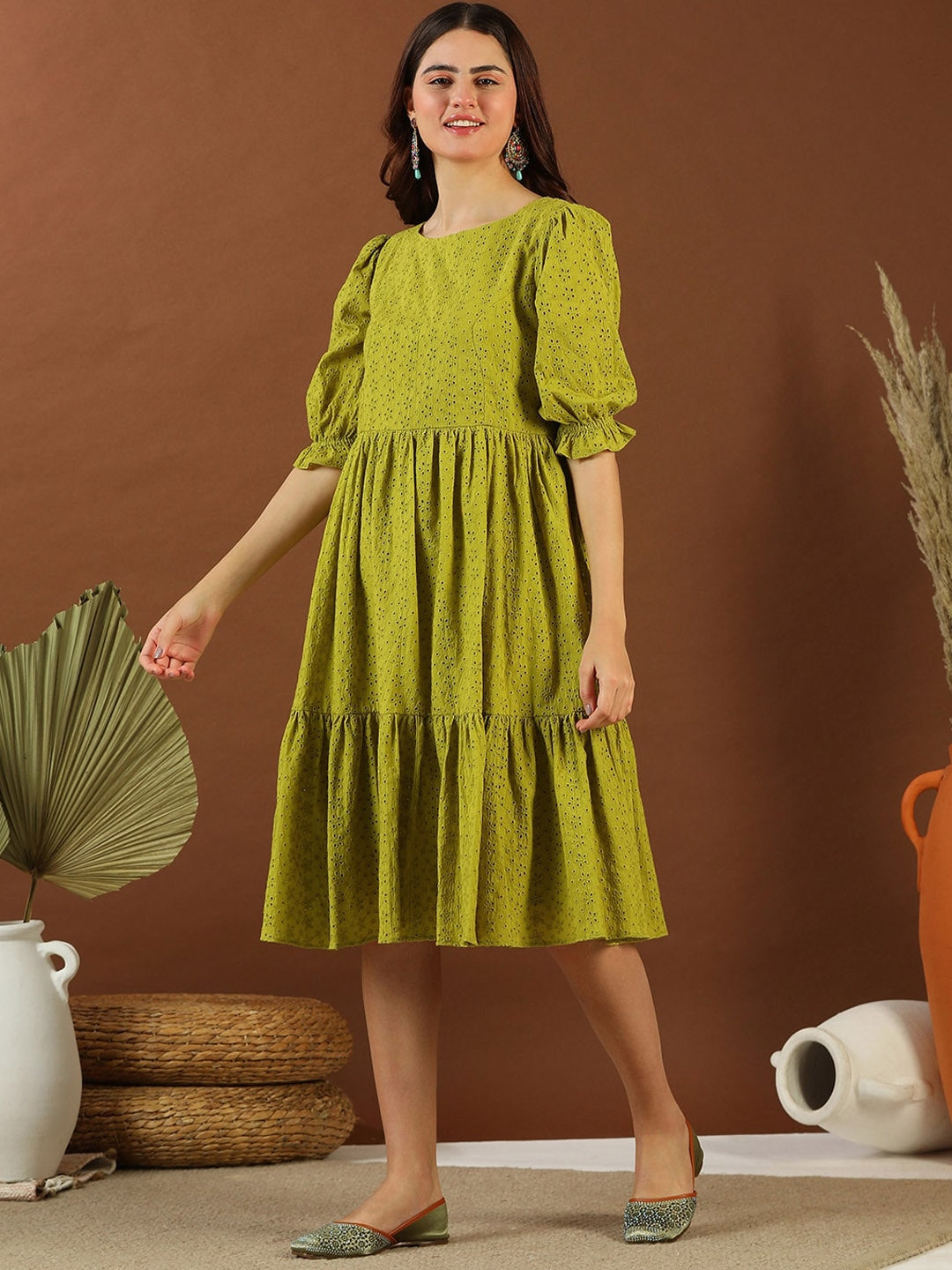 This green midi ethnic dress features delicate Chikankari embroidery and a fit-and-flared shape for a flattering and unique look. The round neck, short puff sleeves, and flared hem add stylish details, while the slip-on closure makes it easy to put on and go. Elevate your wardrobe with this stunning, handcrafted cotton dress.