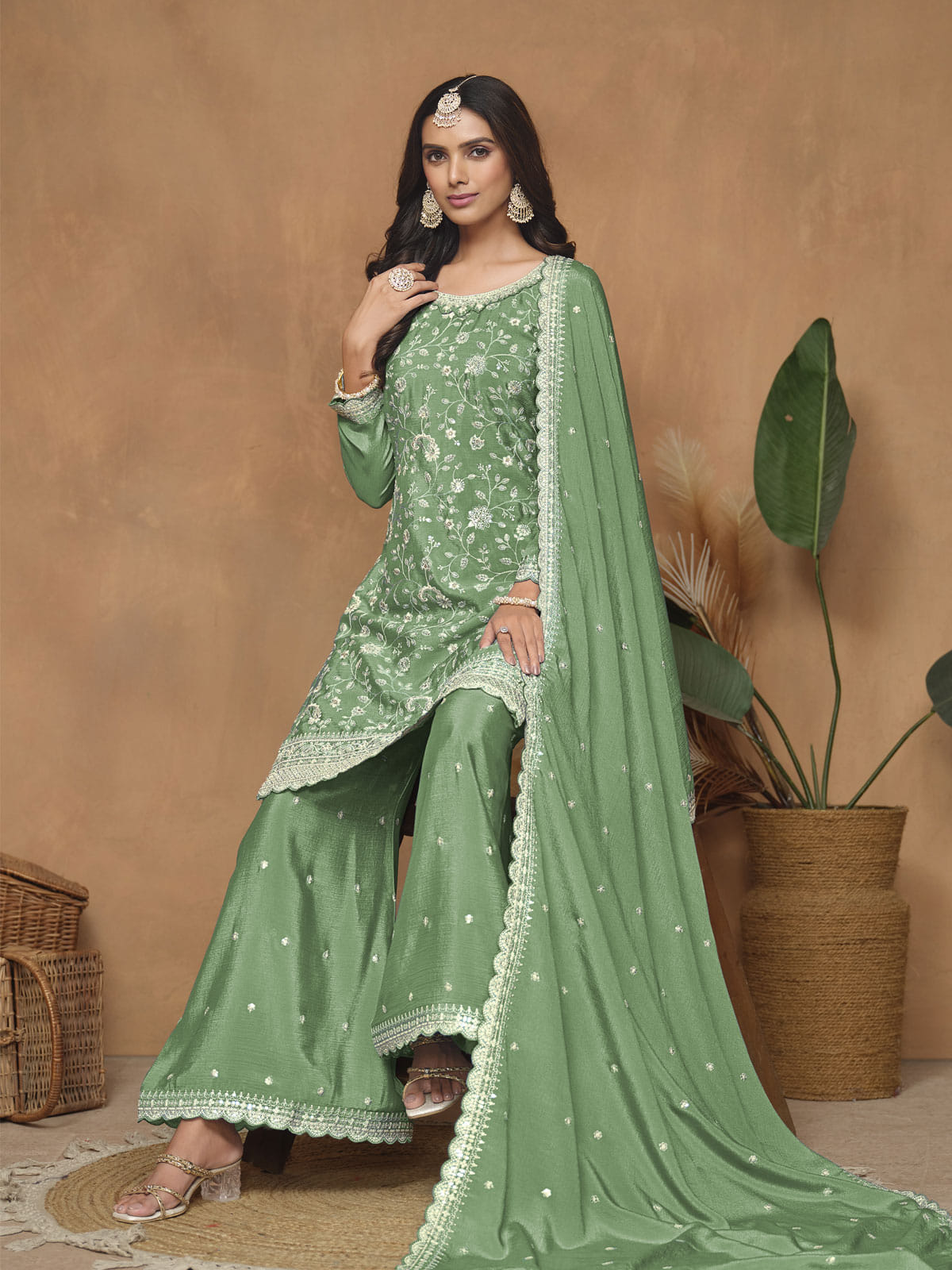 Look absolutely stunning at weddings or festivals in this Green Chinnon Resham & Sequins Embroidered Palazzo Suit by Empress! The intricate resham thread and sequins embroidery, along with its eye-catching green color, will make you the center of attention. Complete the look with traditional accessories. (Comes with matching dupatta & palazzo bottom!)