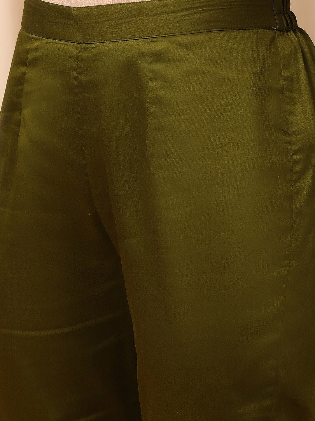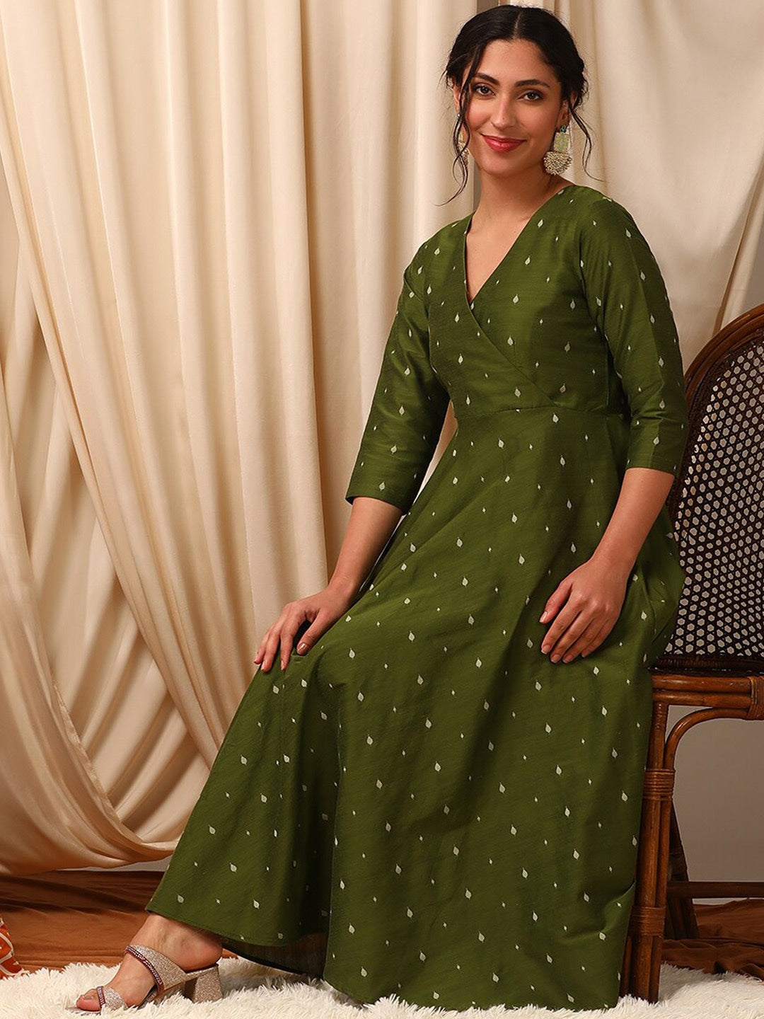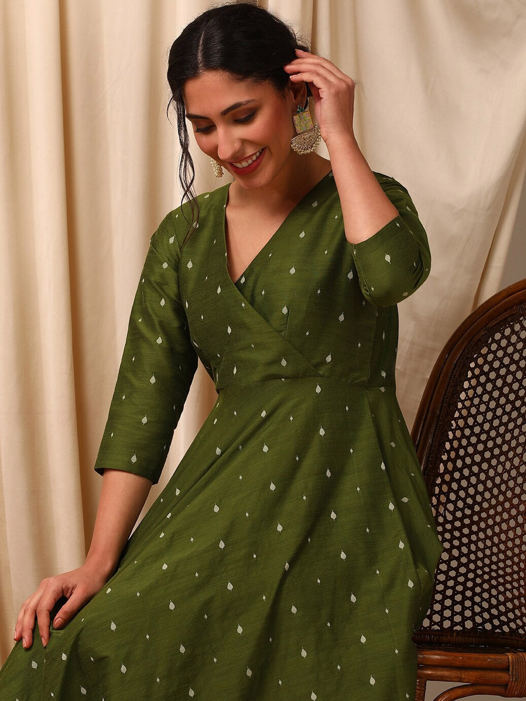 The Green Colour Women Ethnic Motifs Sequinned Anarkali Kurta is a stylish and elegant choice for any ethnic occasion. With a beautiful green color and intricate ethnic motifs, this kurta is sure to make a statement. The V-neck and short, regular sleeves add a modern touch to the traditional Anarkali shape, while the pleated style and sequinned detail exude sophistication. Crafted from machine weave regular silk, this calf length kurta features a flared hem for a flattering silhouette. Perfect for a timeless and fashionable look.