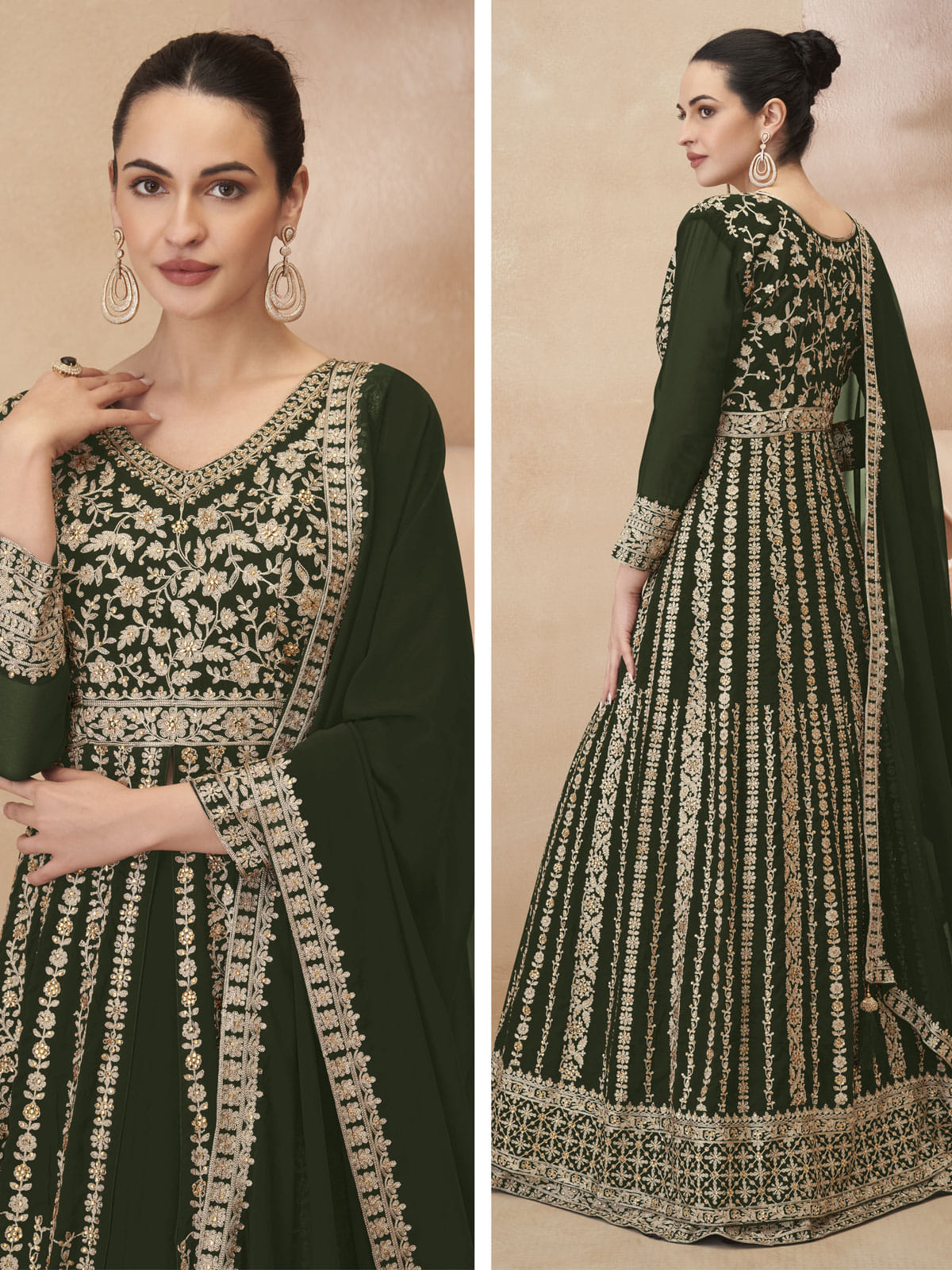 This traditional Dark Green Embroidered Anarkali Lehenga Style Suit is a radiant and exquisite piece, featuring detailed cording zari, resham thread, and crystal stone work. Made with premium georgette, it includes a slit-style top and flared Lehenga Style Suit, which pairs perfectly with the embroidered dupatta with tassels. Perfect for festive gatherings, elevate your look with statement earrings and high heels.