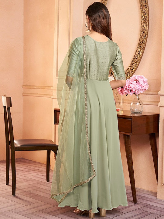 This elegant Green Embroidered Fit & Flare Georgette Ethnic Dress & Dupatta is perfect for any special occasion. The machine weave regular georgette material ensures a comfortable fit while the embroidered detailing adds a touch of sophistication. The maxi length with flared hem creates a flattering silhouette, and the included dupatta adds a finishing touch to this stylish ensemble. Perfect for those looking for a solid, v-neck dress with short, regular sleeves.