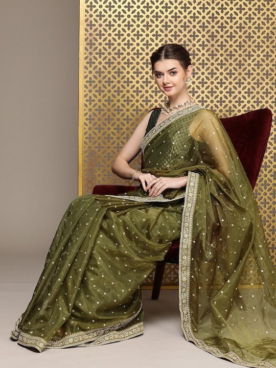 Elevate your style with our Green Embroidered Sequinned Organza Saree. This saree features intricate embroidery and sequin detailing, adding a touch of elegance to any occasion. The included unstitched blouse piece allows for customization, making it a versatile addition to your wardrobe. The model blouse is for display purposes only, refer to the image for the actual blouse design.