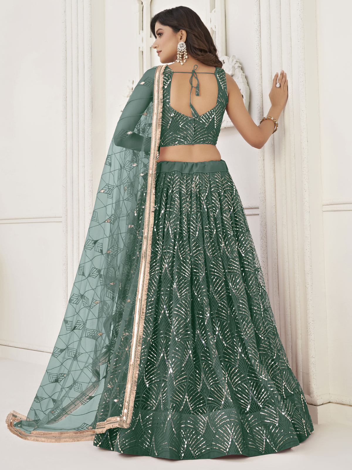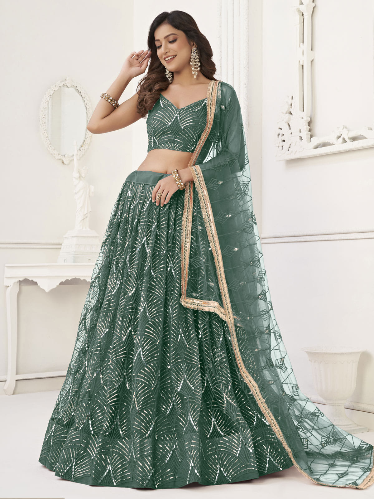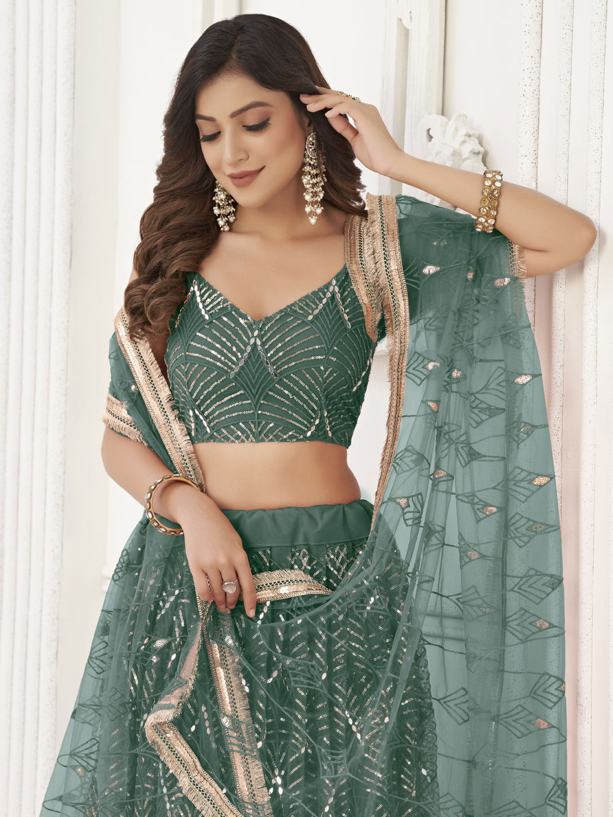 This exquisite Green net lehenga choli is perfect for any wedding event. The intricate embroidery, mirror, sequins, and thread work make it a stunning piece that will surely make you stand out. Look stylish and graceful in this fantastic outfit. Comes with matching choli and dupatta.
