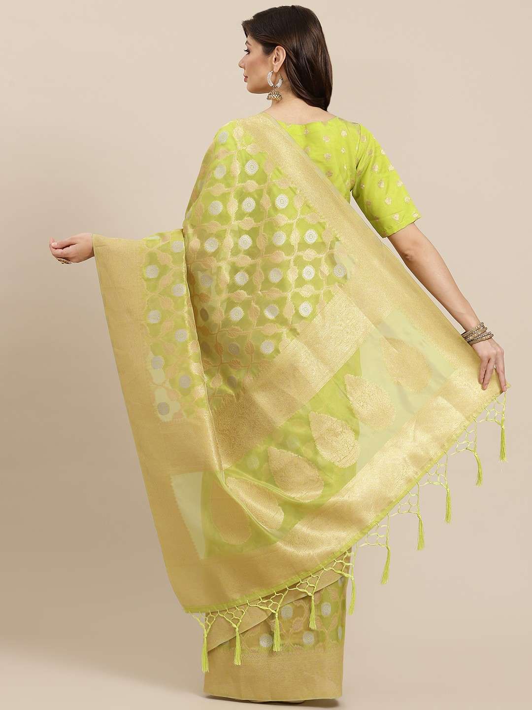 This stunning Green & Golden Woven Design Jaali Organza Banarasi Saree is crafted with intricate woven design and jaali detailing. The woven design border adds a touch of elegance to this traditional saree. It comes with an unstitched blouse piece for versatile styling options. Elevate your wardrobe with this beautiful saree.