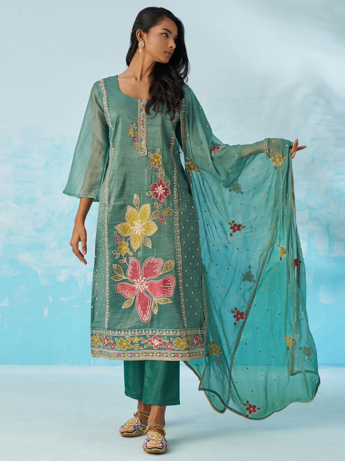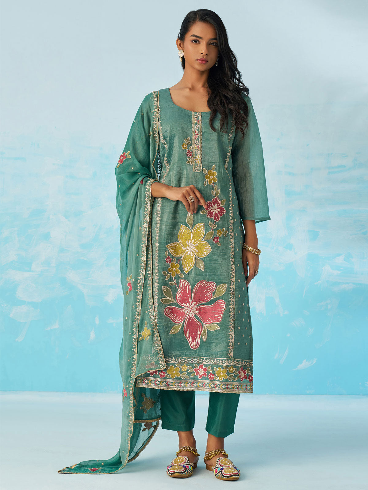 Discover the refined elegance of this Persian Green Salwar Suit, where traditional craftsmanship meets contemporary comfort. This meticulously designed ensemble features a harmonious blend of sophisticated tailoring and premium fabric, making it an ideal choice for weddings, festivals, and cultural celebrations. The coordinated dupatta adds an extra layer of grace and versatility to your wardrobe. Whether you're attending a family gathering or a special occasion, this salwar suit delivers understated luxury with every wear. A timeless investment piece that celebrates your cultural heritage while ensuring you look and feel your absolute best.