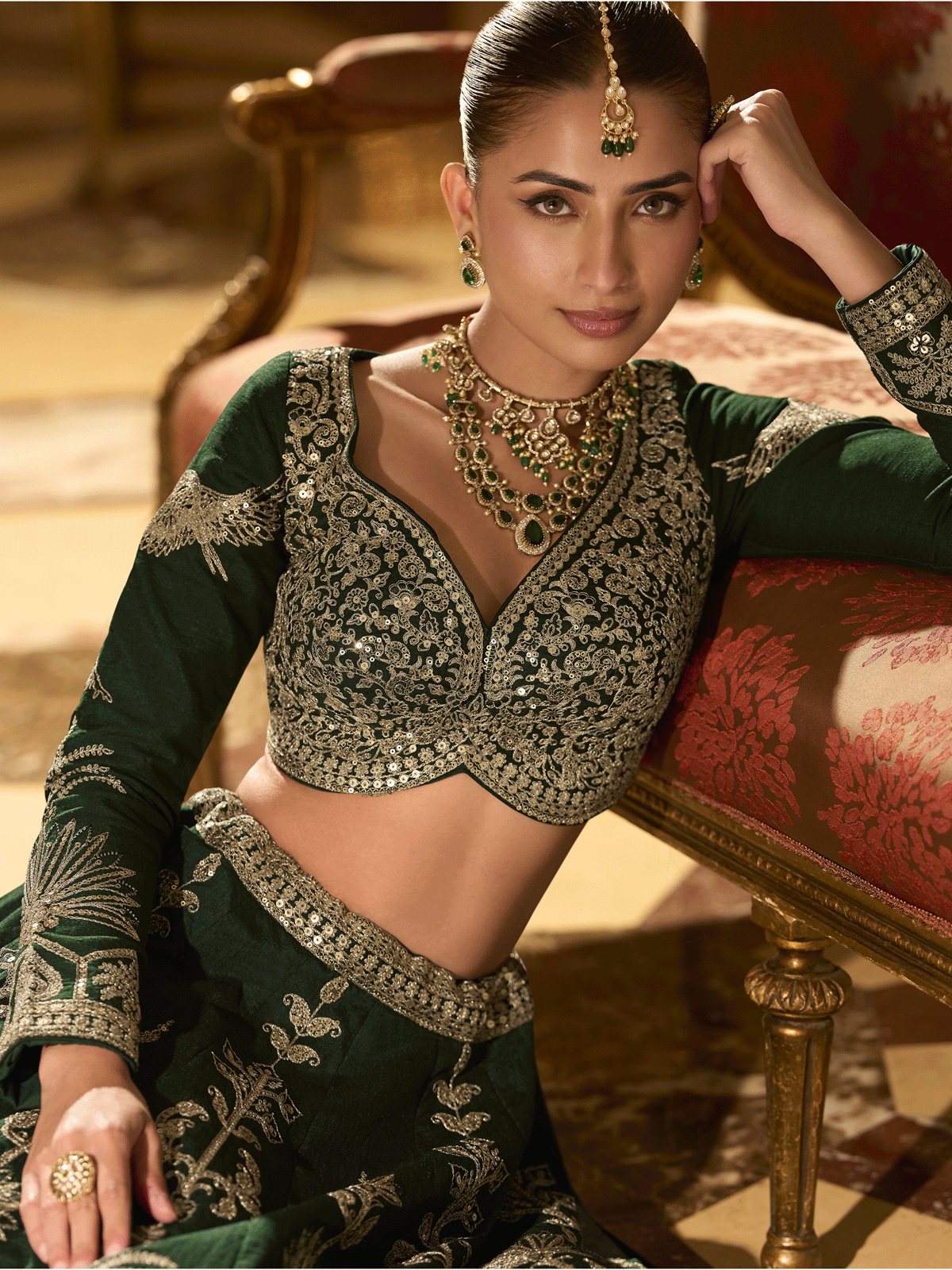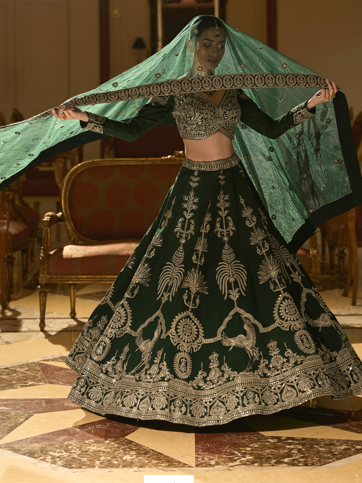 Embrace timeless sophistication in this Green Premium Silk Lehenga Choli, a masterpiece designed for discerning brides and wedding guests. Crafted from luxurious silk, this ensemble showcases meticulous artisanal detailing—resplendent zari threadwork, shimmering sequins, and intricate mirror embroidery that dance across the fabric. Each element is thoughtfully positioned to create dimensional depth and radiant luminosity, ensuring you command attention at weddings and bridal celebrations. The expert craftsmanship reflects Inddus's commitment to quality, blending traditional techniques with contemporary design sensibilities. Perfect for those who appreciate authentic Indian couture and refuse to compromise on elegance.