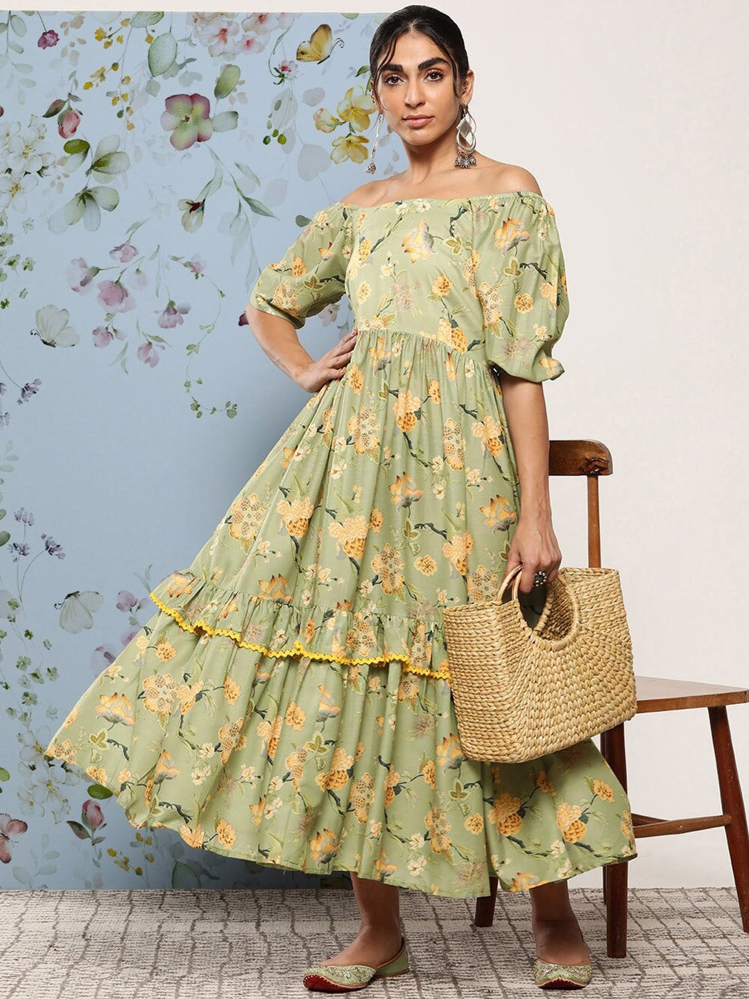 This Green Printed Fit & Flared Ethnic Dress features a beautiful floral print, a flattering fit and flared shape, and a square neck and short sleeves for added style. The flared hem and slip-on closure make it easy to wear and comfortable. A perfect mix of fashion and comfort.