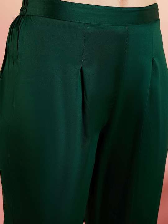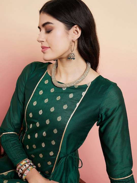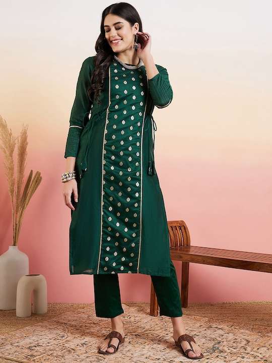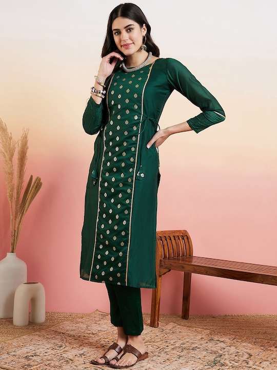 This green kurta with trousers is a must-have for any woman's wardrobe. The ethnic motifs woven design and straight shape add a touch of elegance, while the chanderi cotton fabric ensures comfort and durability. The regular style, round neck, and 2 pockets with zari detail make it both stylish and functional. The solid trousers with a partially elasticated waistband and slip-on closure complete the look. Perfect for both casual and formal occasions.