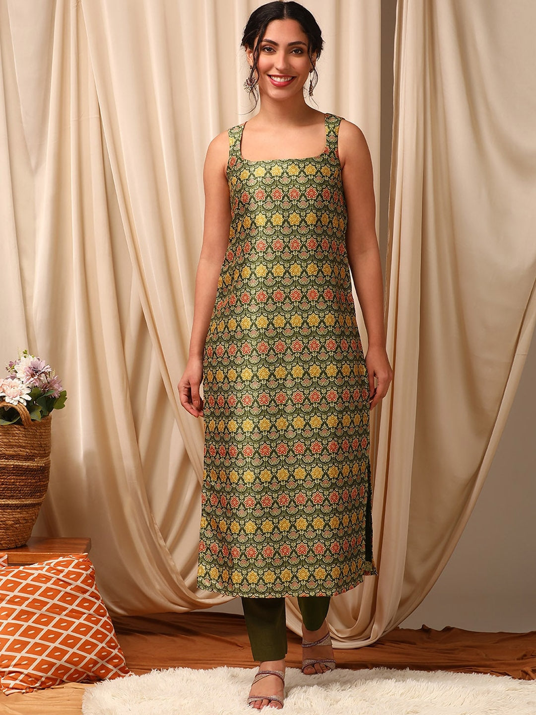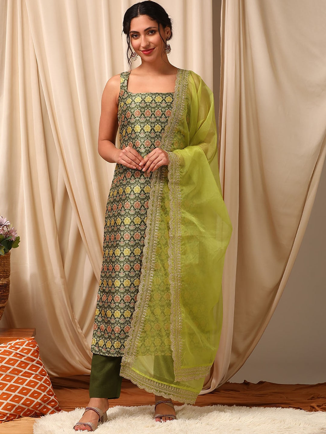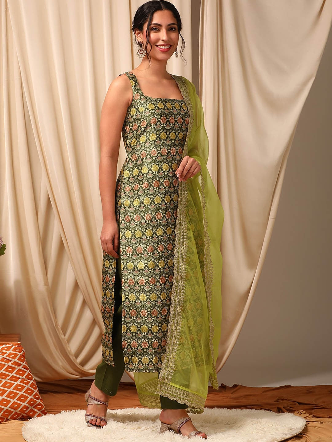 This Green Women Regular Kurta with Trousers & With Dupatta is a stylish and versatile outfit option. The Kurta features a unique woven design and a U-neck with sleeveless shoulder straps for a sophisticated look. The Trousers have a partially elasticated waistband for comfort and ease of wear. Made with high-quality silk blend fabric, this outfit is both durable and elegant.