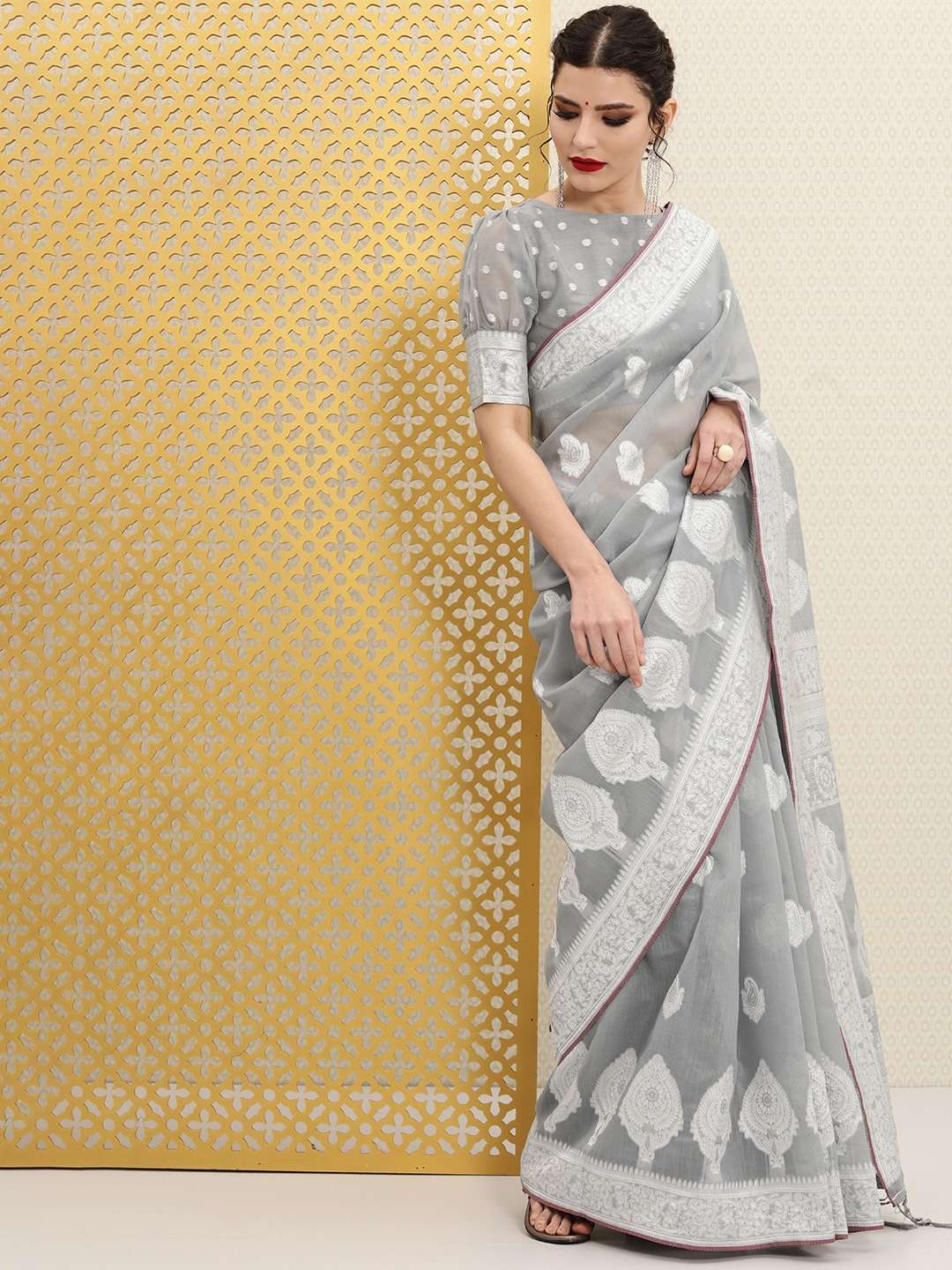This Grey & Silver Paisley Woven Design Rozana Saree features a beautiful paisley woven design and a contrasting border, creating a sophisticated look. Crafted with high-quality materials, it offers a comfortable fit and an elegant finish. Comes with an unstitched blouse piece for versatile styling options.