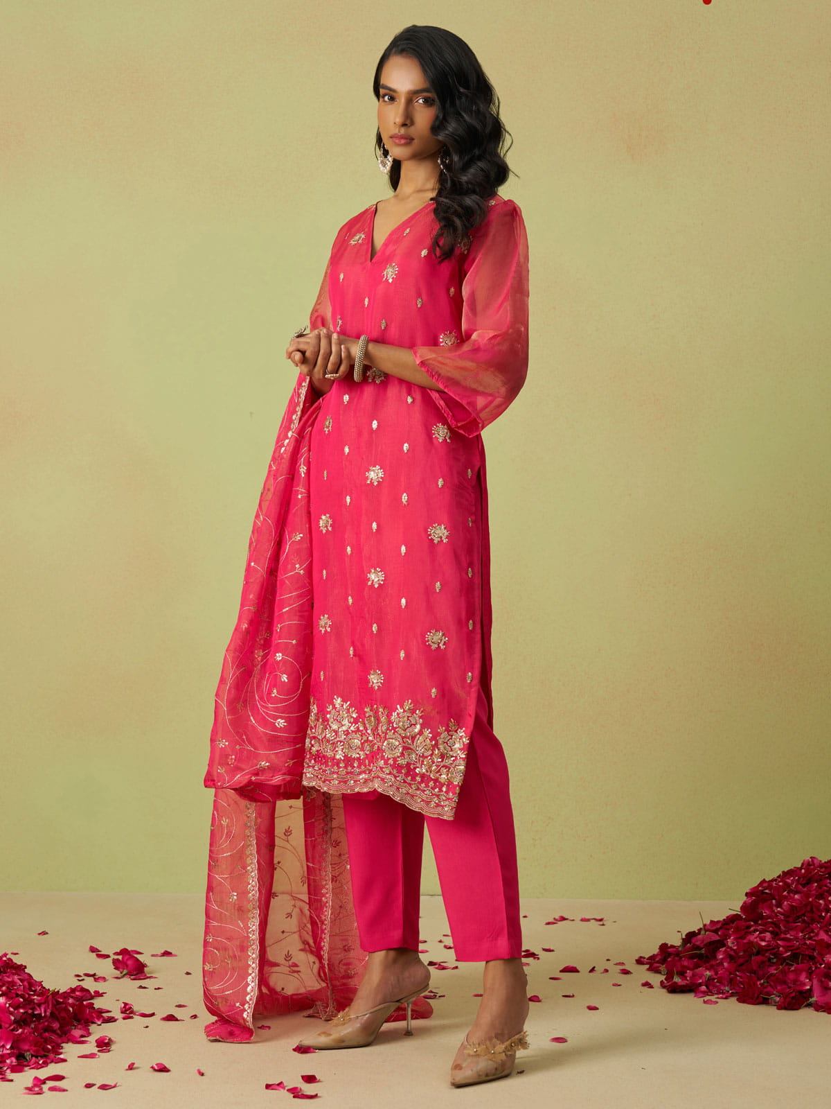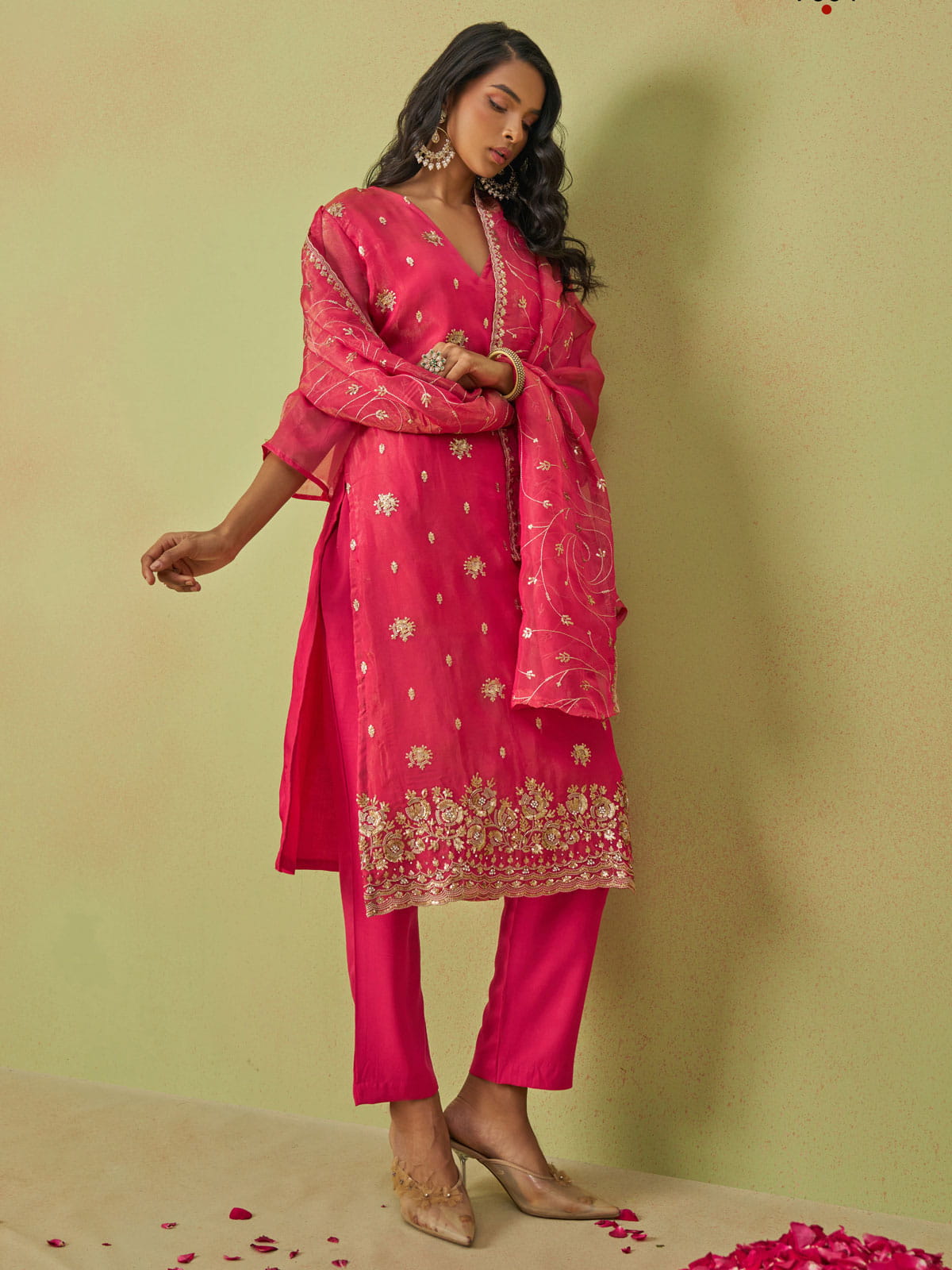 Elevate your style with our Pink Pure Shimmer Organza Embroidered Kurta Set. Made with the finest shimmer organza fabric and featuring exquisite embroidery and khatli work, this set guarantees a luxurious and elegant look. Perfect for any occasion, feel confident and sophisticated with this Pant Style Straight Kurta Set.