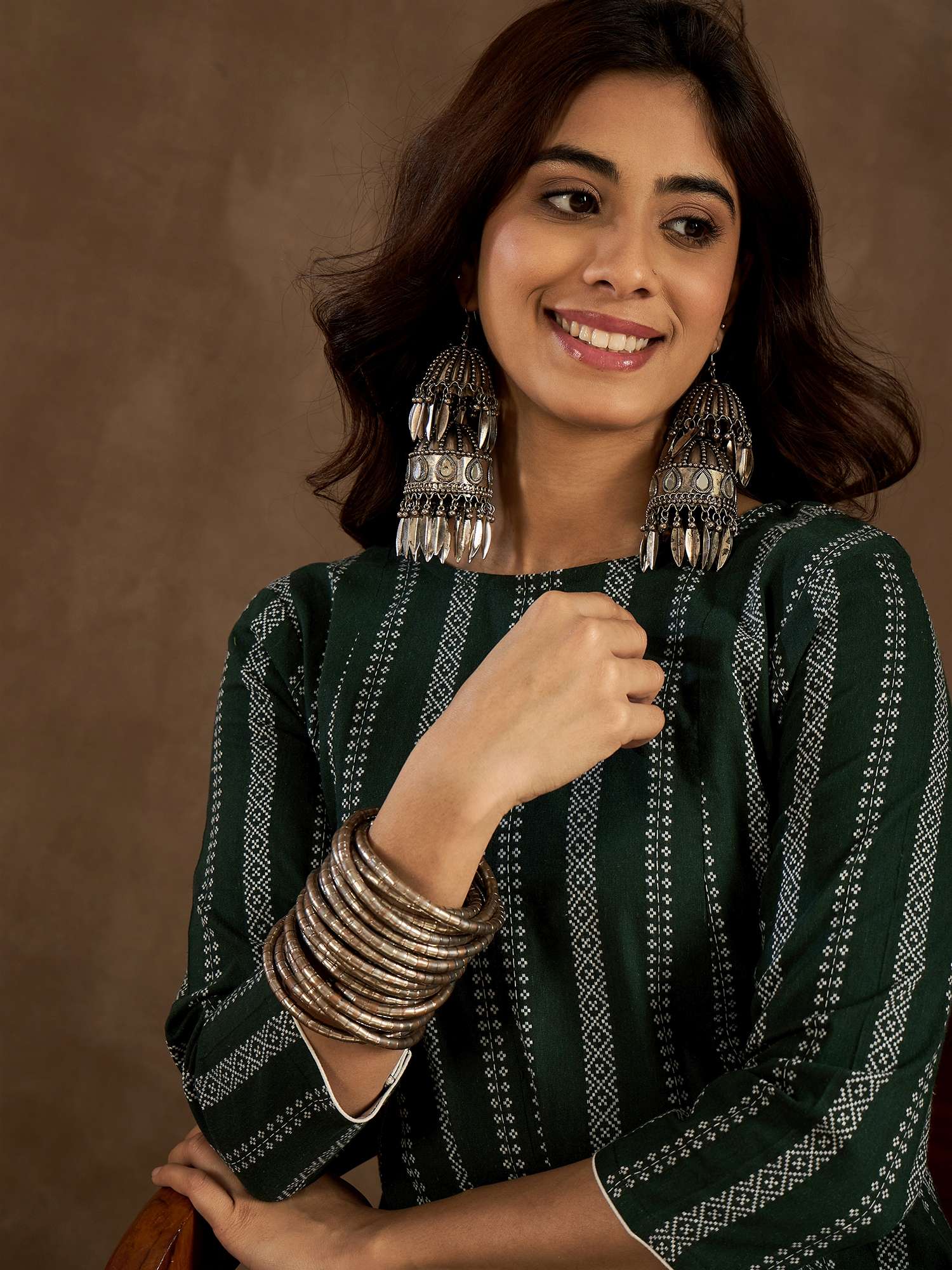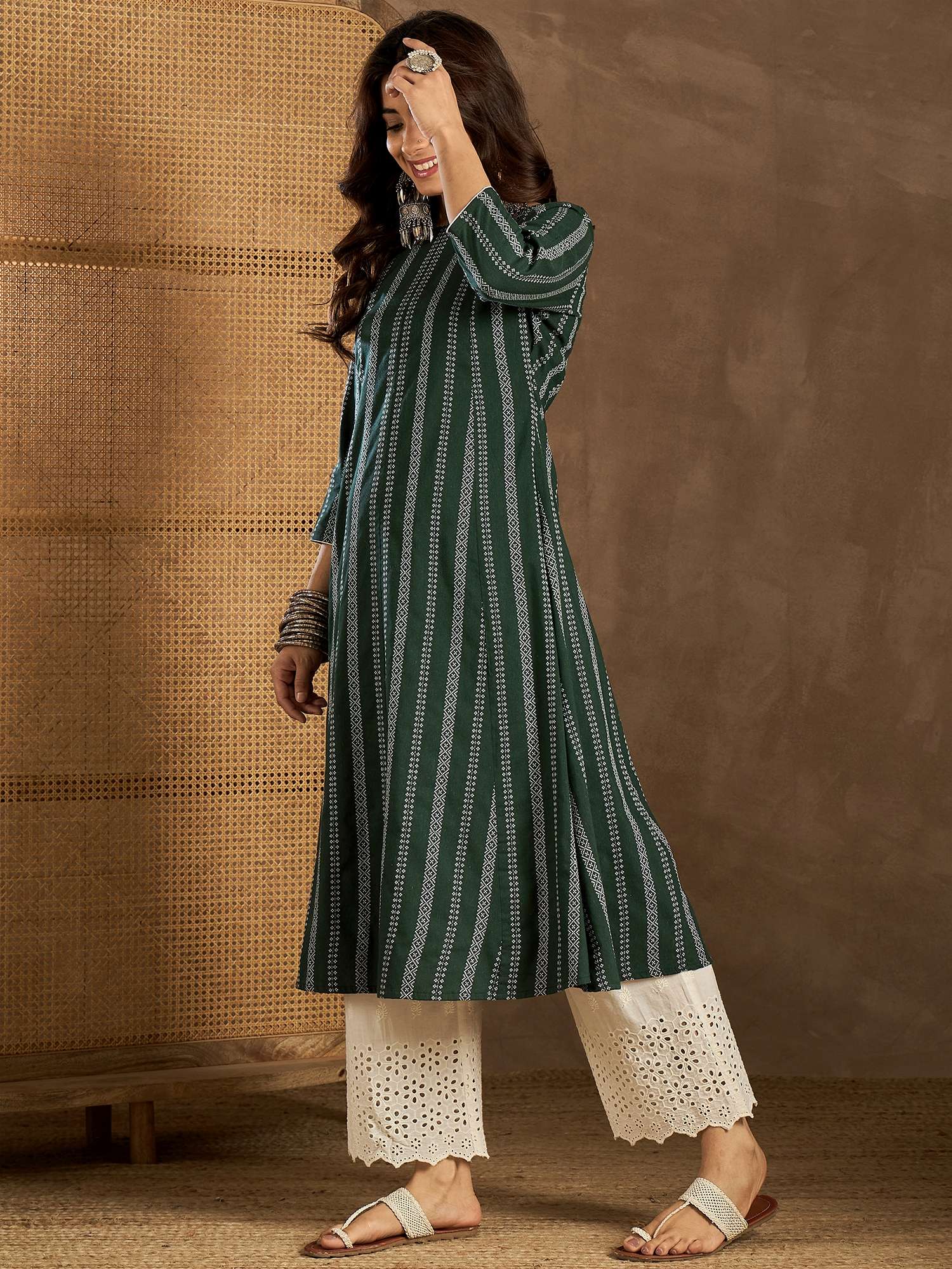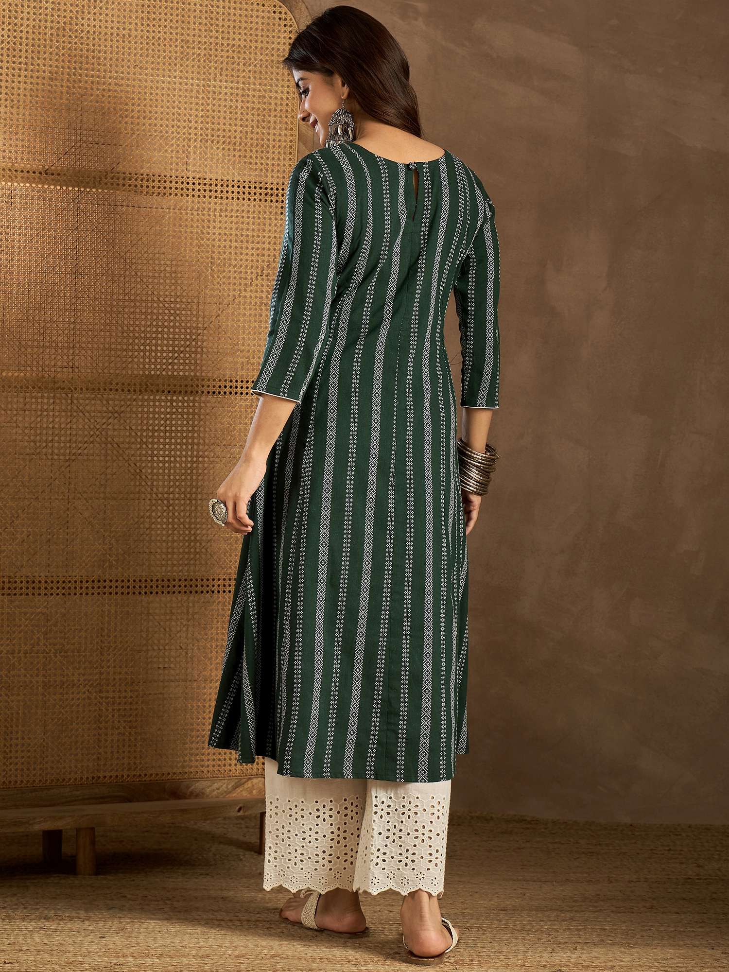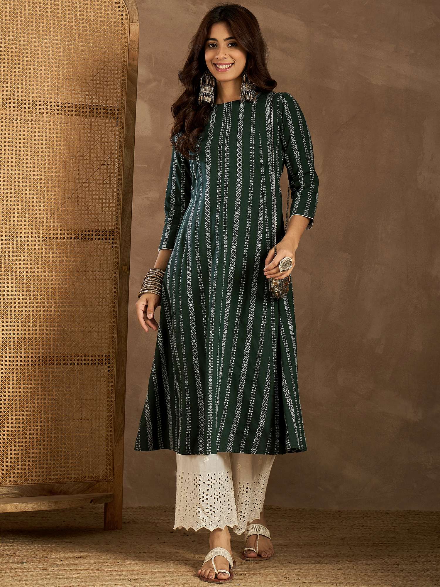 Effortless elegance meets comfort in this women's striped woven kurta. The green and white striped design features a flattering A-line silhouette that flows gracefully to the calf with a delicate flared hem. Crafted from regular cotton with a machine-woven finish, it offers breathable wear for everyday occasions. The round neckline and three-quarter regular sleeves provide a classic, versatile look suitable for casual outings or relaxed gatherings. Size & Fit: The model, standing 5'8", wears a size S, offering a reference for your perfect fit. Material & Care: Made from 100% cotton. Dry clean recommended to maintain the fabric's quality and vibrant striped pattern.