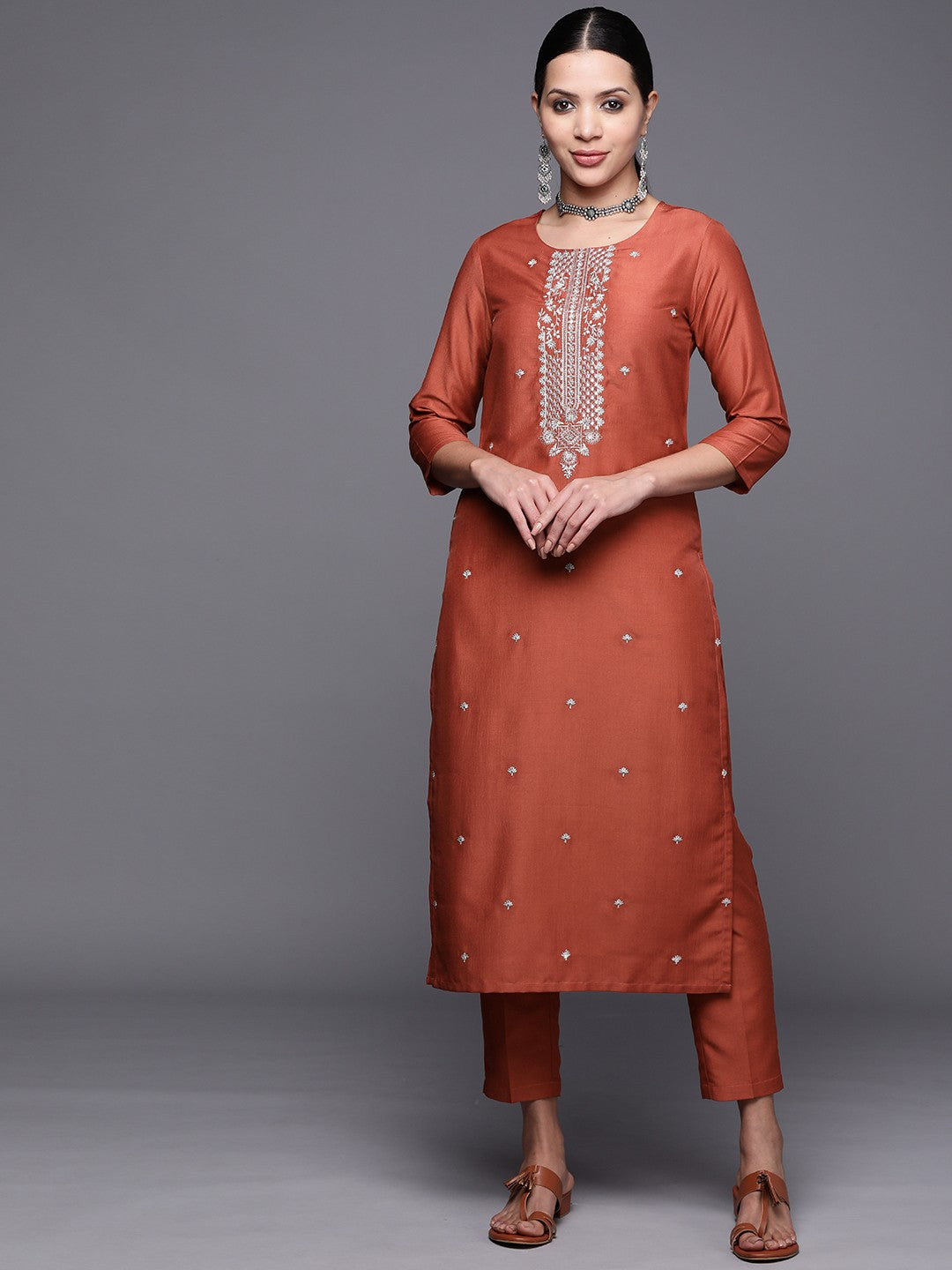 This calf length rust and white embroidered kurta set is a perfect blend of silk and machine weave fabric. The floral embroidery and thread work detail add a touch of elegance. The elasticated waistband and slip-on closure make for a comfortable fit. Elevate your traditional style with this straight-shaped kurta and trousers set.