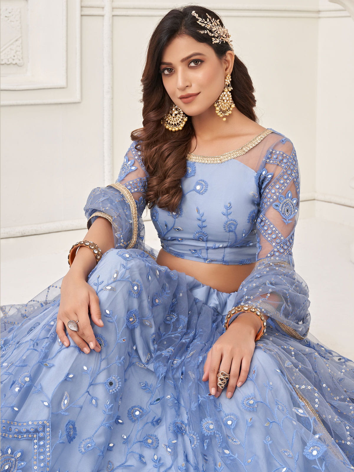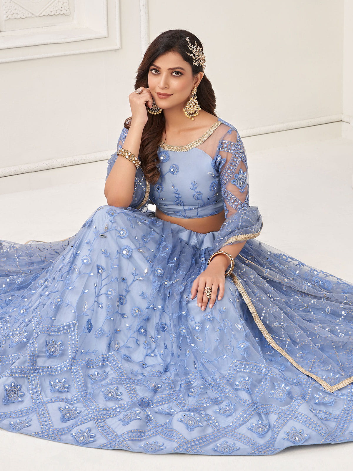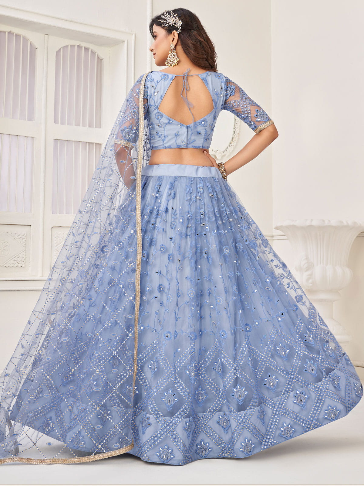 Elevate your wedding look with our Ice Blue Foil Mirror Embroidery Lehenga Choli. The intricate resham thread and sequence embroidery on soft net adds an ethnic touch. The flared lehenga with satin lining and cancan detail is equally embellished. Complete your ensemble with golden jewelry and heels for a stunning bridal look.