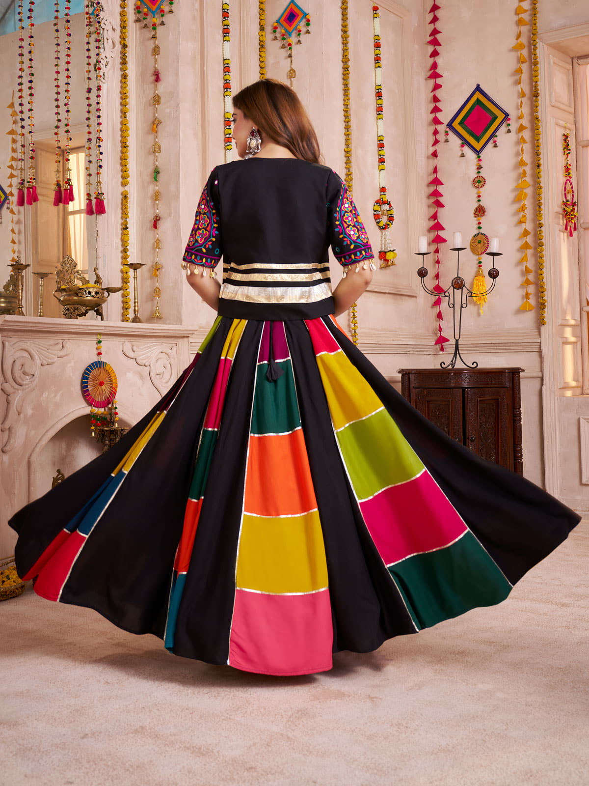 Celebrate Navratri with the Jacket Style Designer Multi Color Chaniya Choli, expertly crafted from premium viscose cotton for comfort and elegance. This traditional outfit features vibrant multi-color patchwork stitching that highlights cultural authenticity while adding stylish depth. The lehenga, with a generous 9-meter flair, moves gracefully with every dance step, ideal for festive gatherings and Garba nights. Designed to fit comfortably with a 42-inch waist and 40-inch length, it offers both style and ease throughout your celebrations.