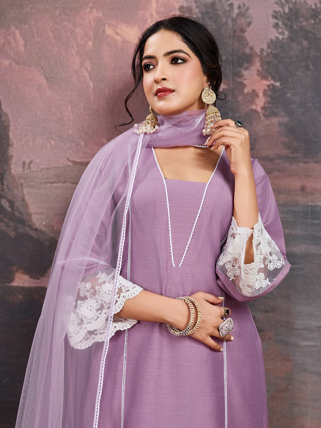 Introducing our mauve and white solid kurta set, designed with intricate lace work detailing on a square neck and three-quarter sleeves. The straight, panelled style and regular silk blend give a machine woven finish. The set includes solid trousers with an elasticated waistband for comfort, and a solid dupatta with a tapping border for a complete look.