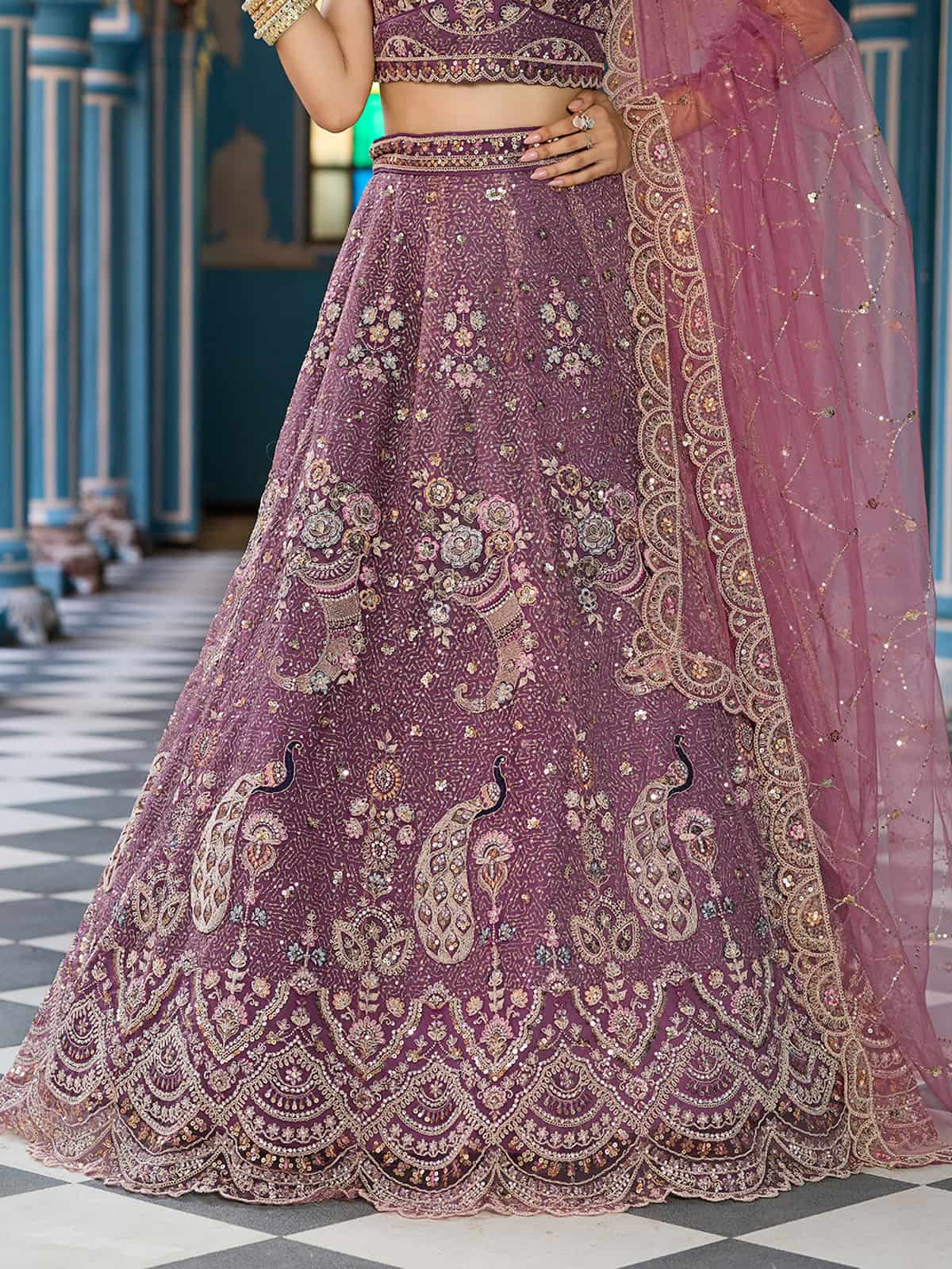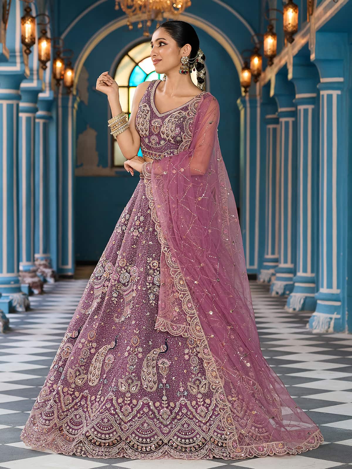 Elevate your ethnic wardrobe with this exquisite lavender lehenga set, crafted from premium net fabric. The semi-stitched lehenga features an impressive 3.5-meter flair adorned with intricate sequins, stone work, and detailed thread embroidery, complemented by a decorative cutwork border at the hemline. The structured inner includes single shantoon lining with layered buckram for perfect drape and volume. The matching net dupatta showcases heavy coding and embroidered cutwork detailing for added elegance. The unstitched blouse in lavender net presents a flattering V-neck design, embellished with sequins, coding, and fine thread embroidery work, complete with attached shantoon lining. Ideal for weddings, celebrations, and special occasions.