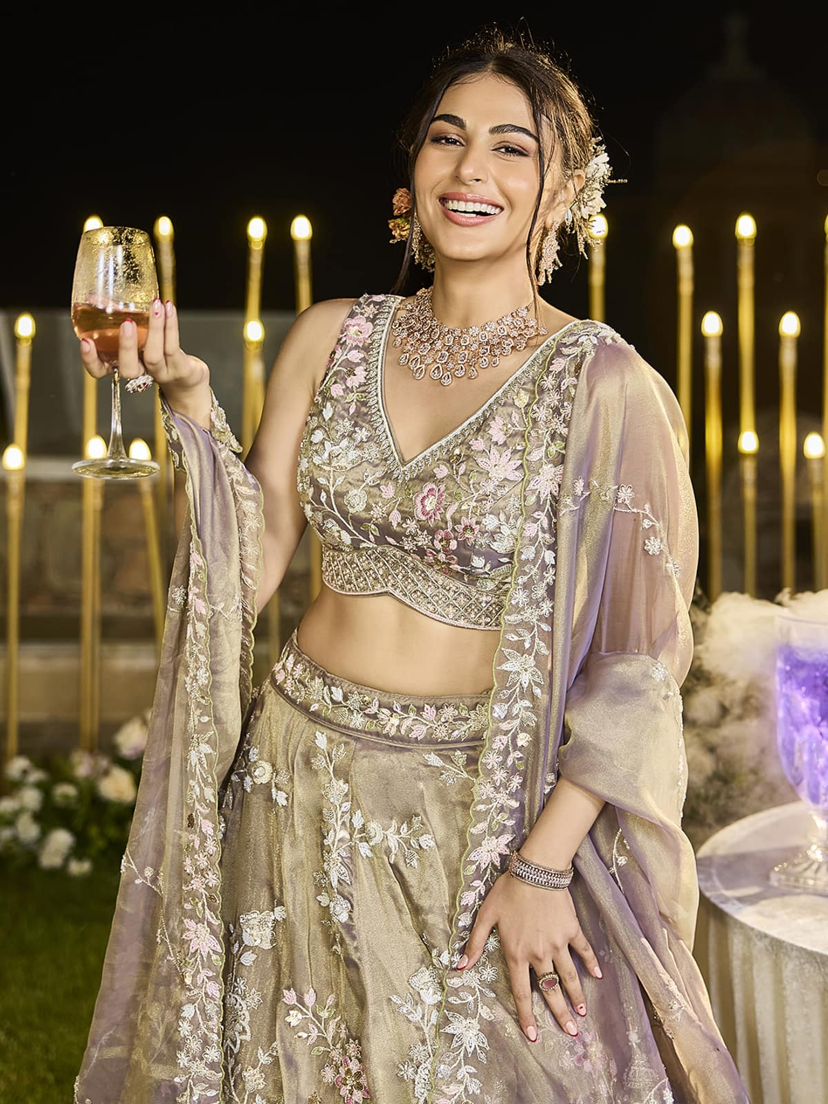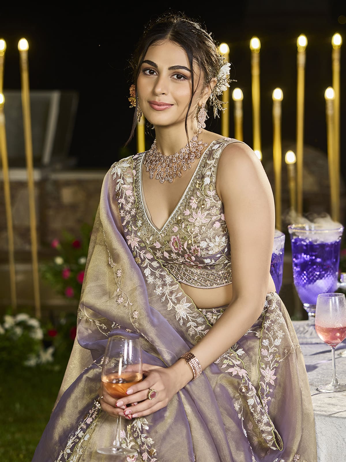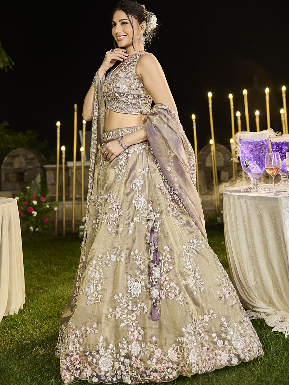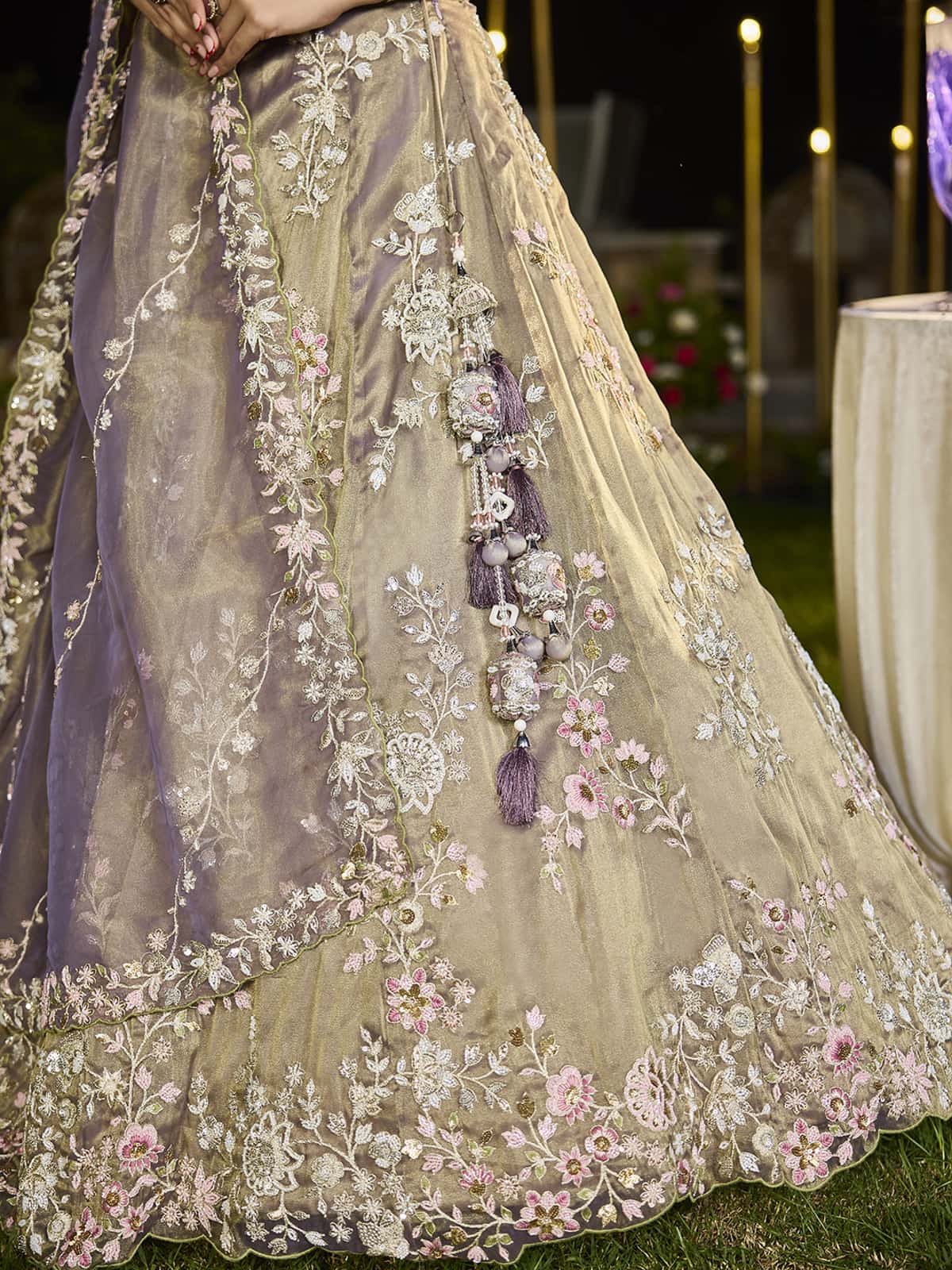 Elevate your festive wardrobe with this exquisite lavender lehenga choli ensemble. The semi-stitched lehenga showcases premium tissue fabric adorned with intricate sequin and coding embroidery, complemented by a delicate thread cutwork border. Engineered for graceful movement, it features a 4.2-meter flair with double shantoon inner lining and layered buckram support for structured volume. The coordinating pink tissue dupatta displays elaborate coding and embroidery with an ornate cutwork border. The matching blouse, crafted in pink tissue with a sweetheart neckline, features heavy sequin and thread embroidery detailing with attached shantoon lining. This semi-stitched design allows for personalized tailoring to ensure a perfect fit for your special occasion.