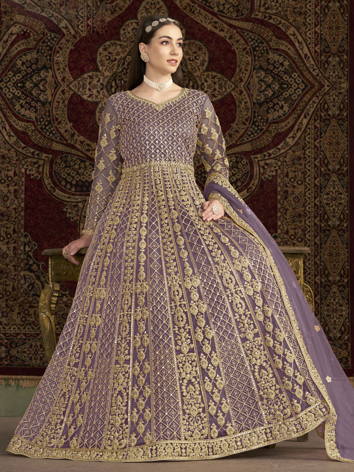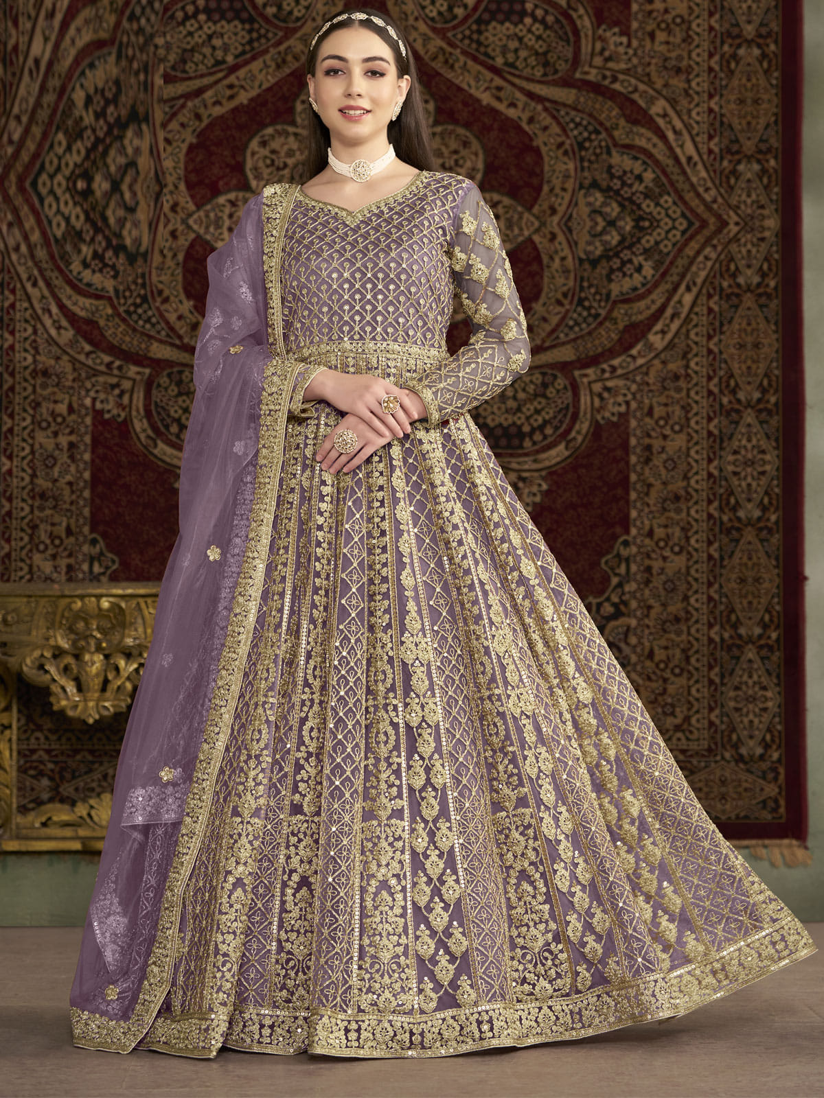 Elevate your style with our Lavender Traditional Embroidery Wedding Anarkali Suit. This exquisite Indian ethnic wear showcases cording reshamkari zari embroidery on a premium net anarkali top, paired with silk santoon pants and lining. The heavily embellished border and butti-embroidered dupatta add a touch of glamour. Perfect for weddings and festive occasions. Complete the look with golden jewelry and stilettos.