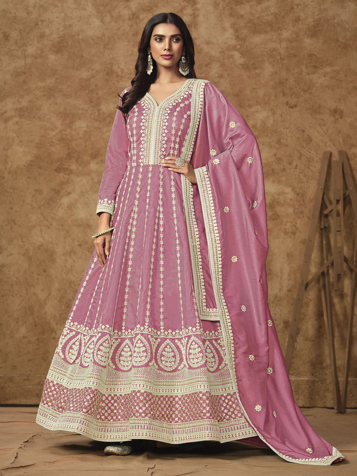 Introducing our Light Pink Silk Anarkali Suit - designed to make you feel like a diva. Made with high-quality dola silk, this traditional anarkali suit features intricate embroidery with resham thread, zari, and sequins work. The matching crape pants, lining, and dupatta add to its elegance. Perfect for any wedding or festive party.
