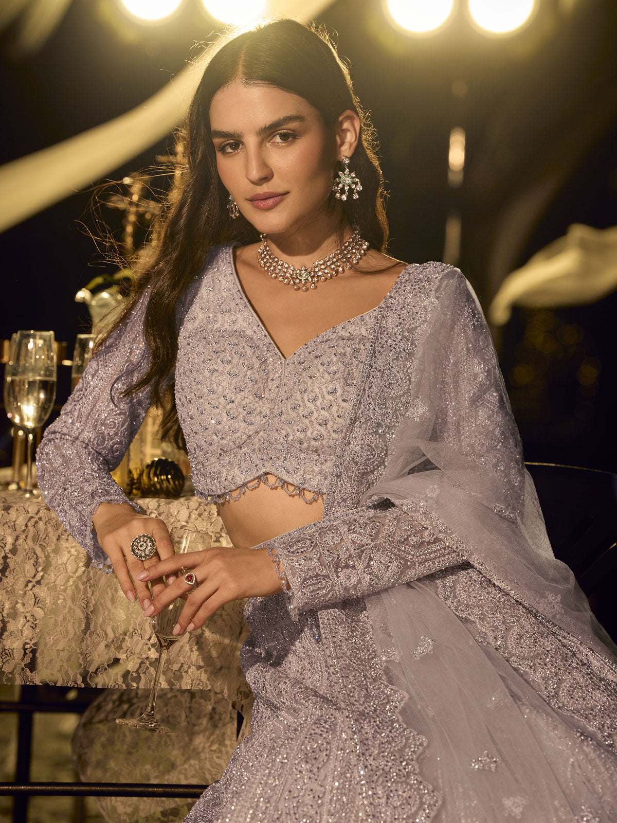 Elevate your bridal ensemble with this exquisite Lilac Net Reception Wear Lehenga Choli, meticulously crafted for the modern bride. The premium net lehenga features intricate hand embroidery with resham thread, sequins, beads, and crystal stone work, supported by luxurious satin and can-can lining for graceful draping. The coordinating net choli and embellished waist belt showcase matching detailed embroidery, while the fully adorned dupatta completes the sophisticated look with rich, flowing elegance. Each element is expertly designed to create a harmonious, statement-making bridal appearance. The blouse accommodates sizes up to 40-42, ensuring a perfect fit. Pair with refined jewellery and heels to complete your wedding day transformation.