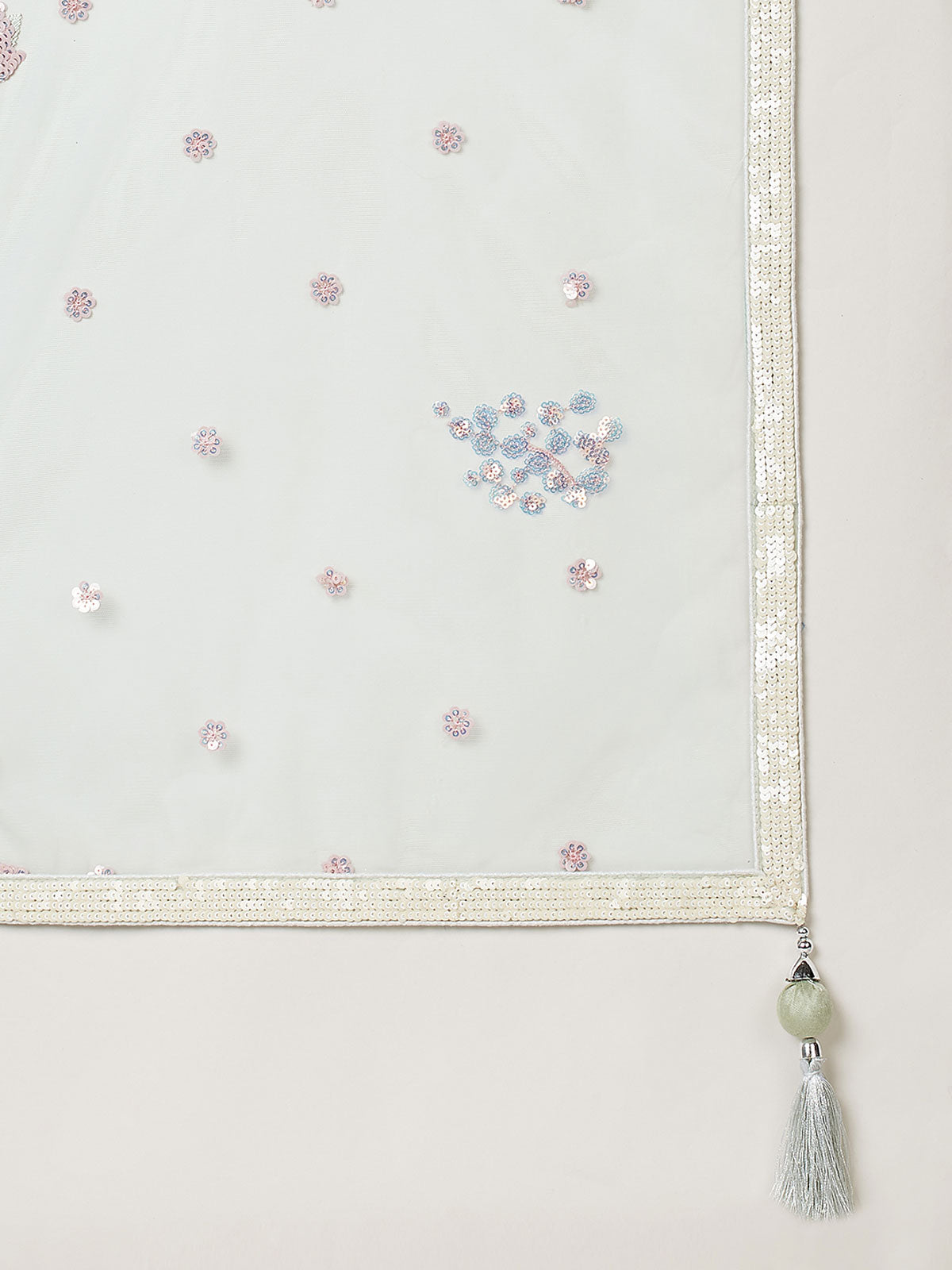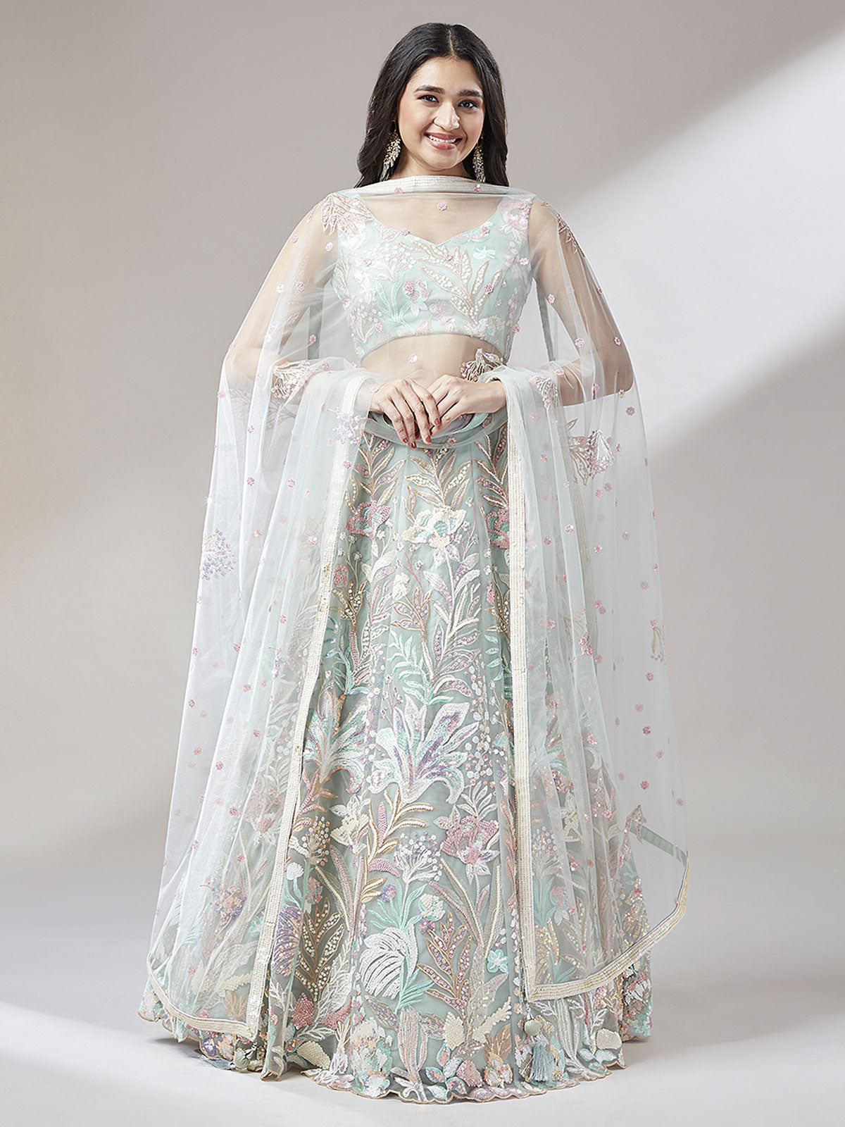 This Lime Green Lehenga features intricate sequin and thread embroidery for a luxurious touch. The semi-stitched design includes double shantoon inner, 2-layer can can, and 2-layer buckram for a full and flared look. The matching net dupatta adds a finishing touch to this stunning ensemble.