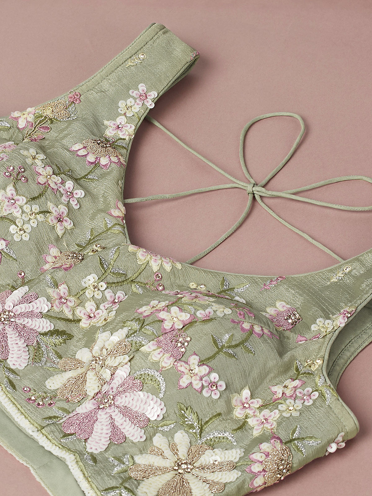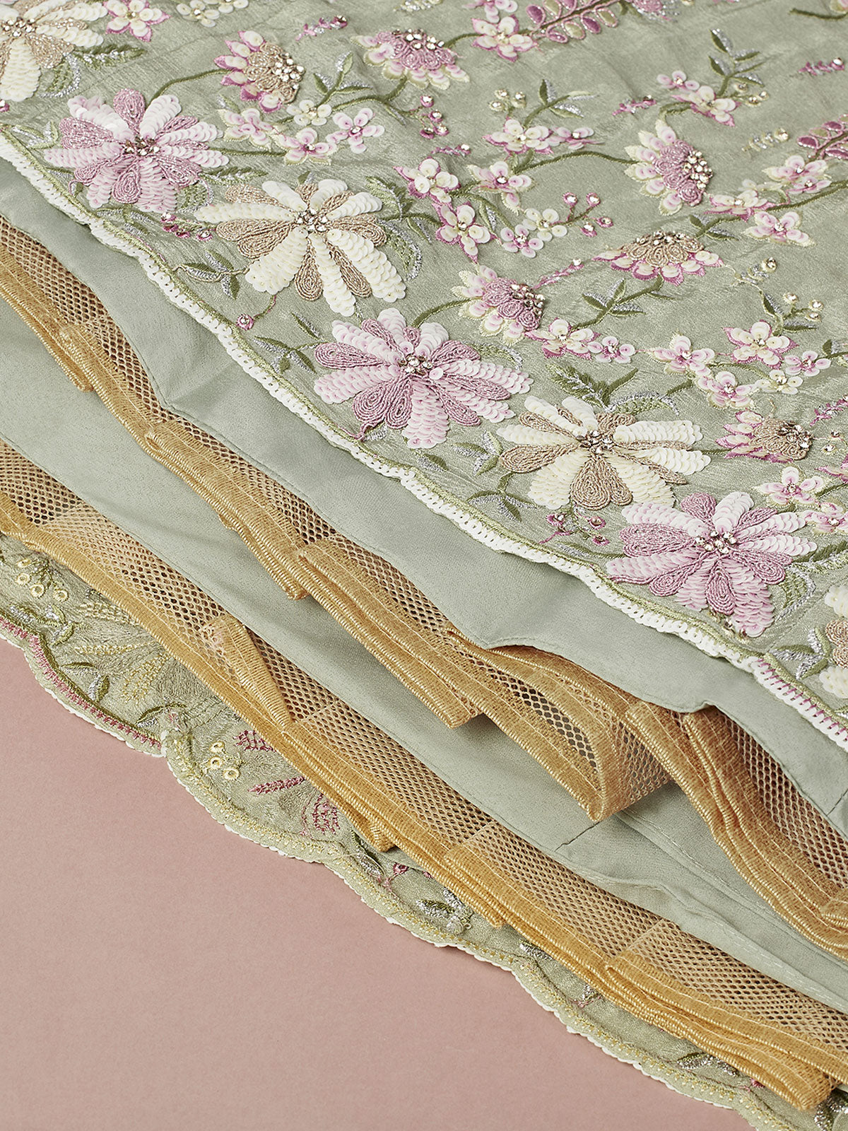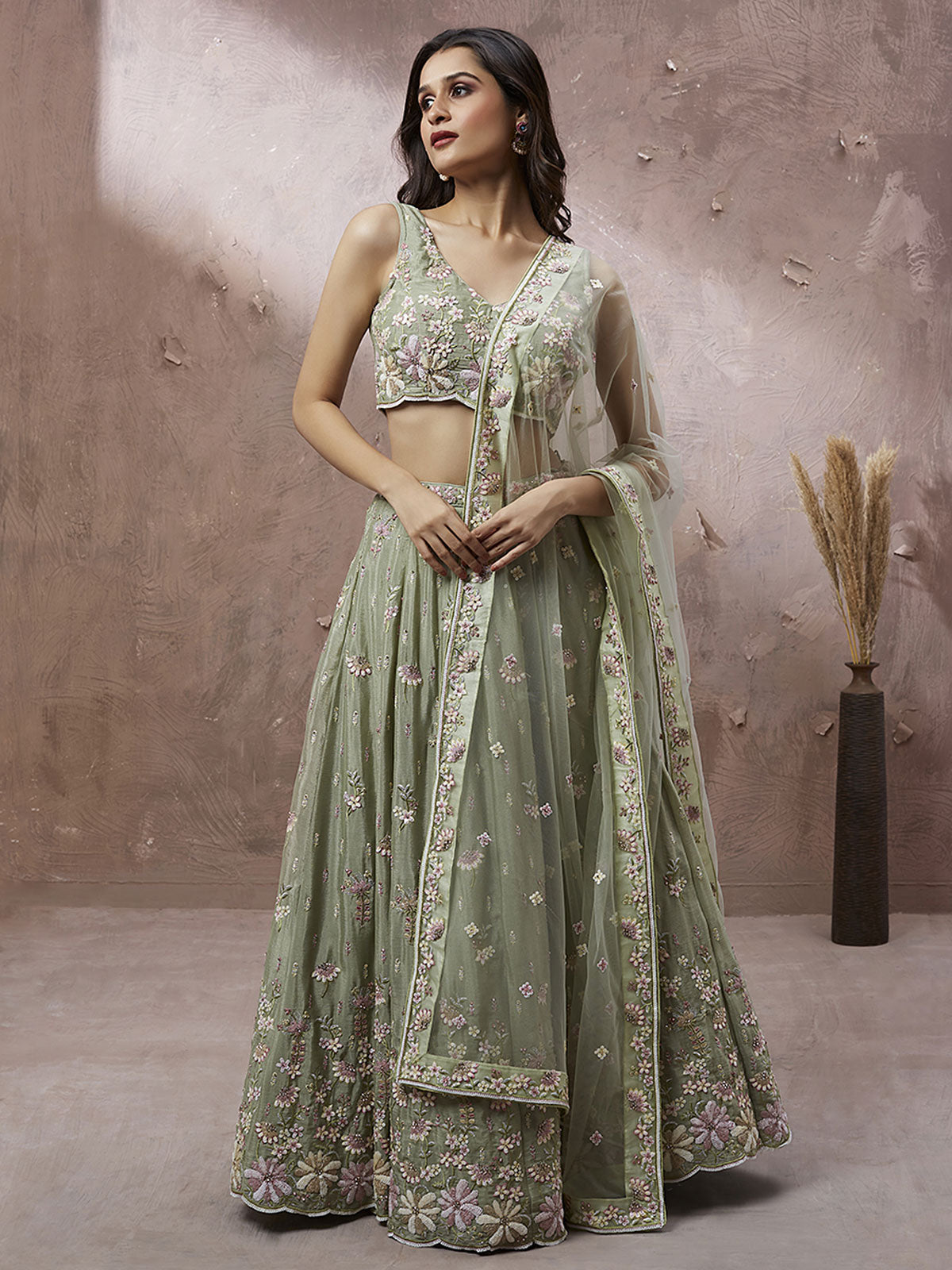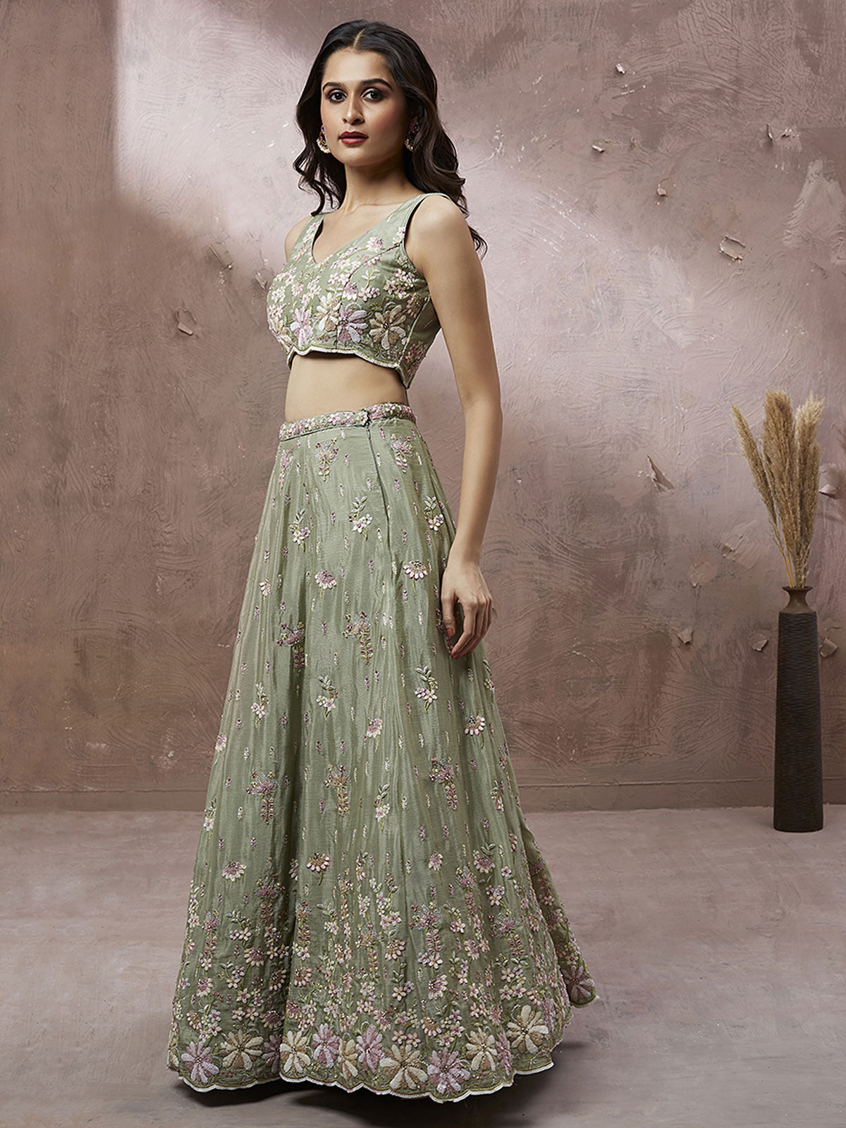 Enhance your ethnic look with our Lime Green Pure Georgette Semi-Stitched Lehenga. Features a heavy Zarkan embroidery and multi-colored sequins work. Comes with a double Shantoon inner, Can Can layers, and a Buckram layer for added volume. The Lime Green Net Dupatta adds elegance with its sequin work and lace border. And complete your look with the stunning tassels adorned on the sequin embroidered waist belt.