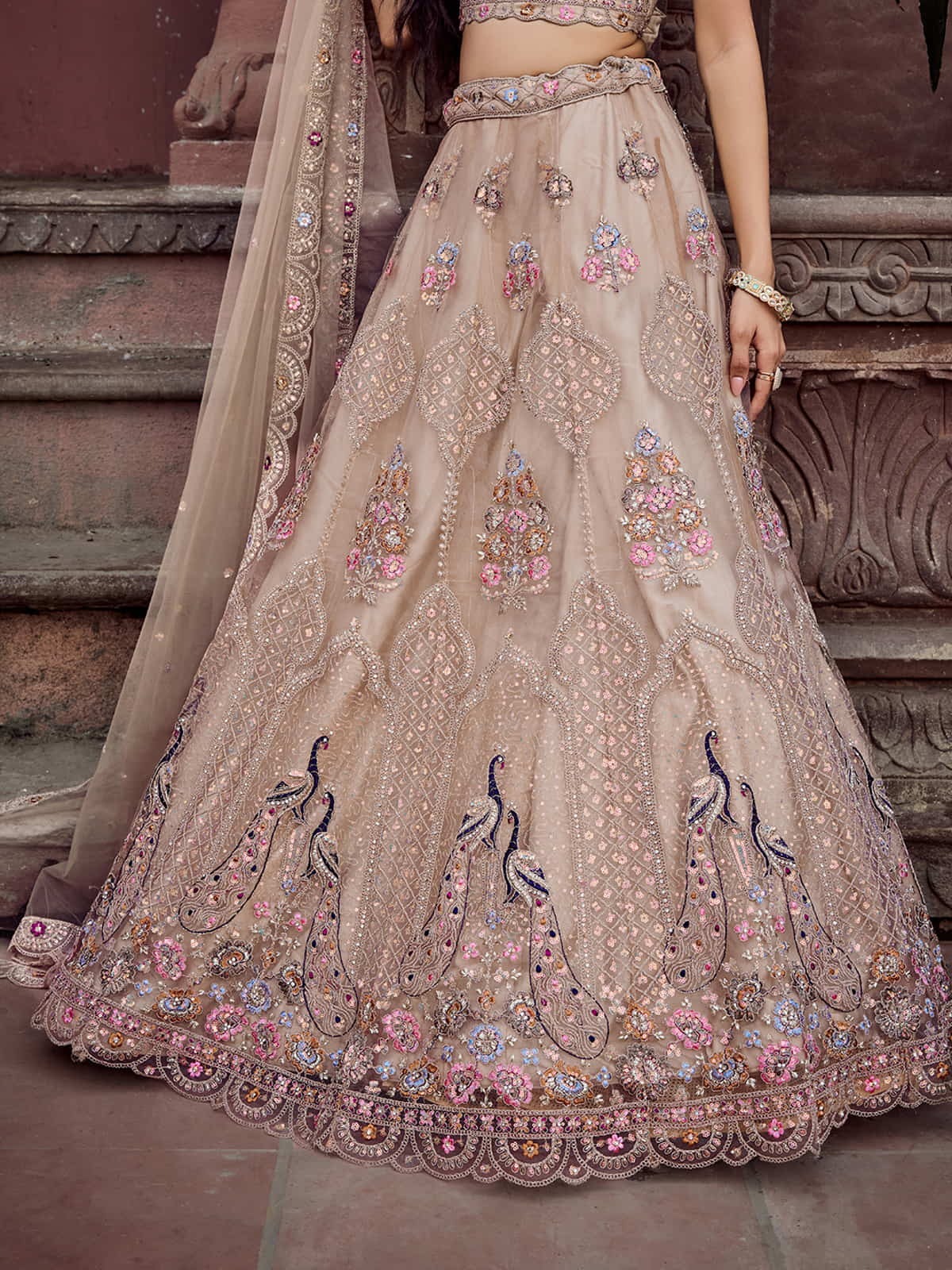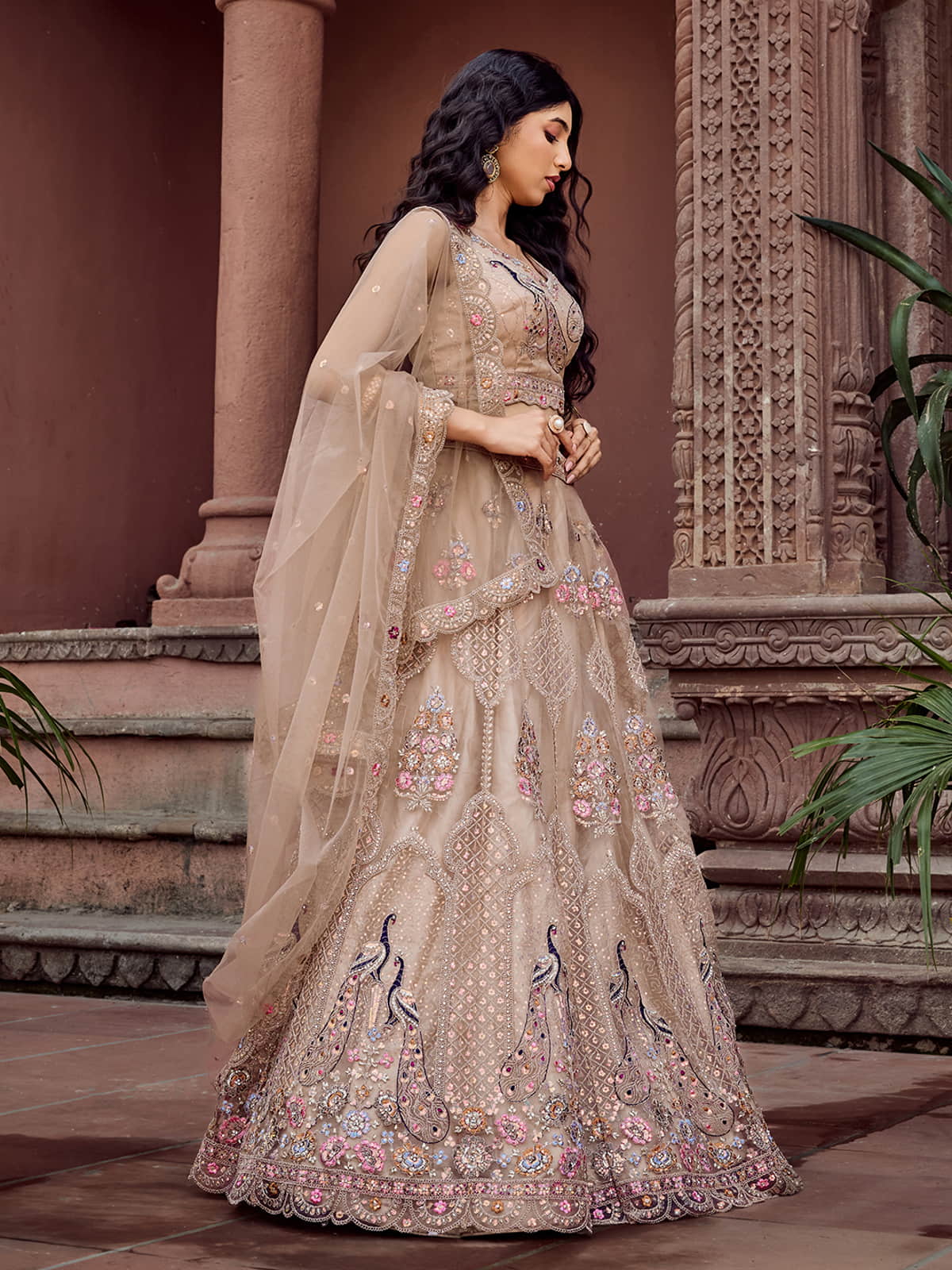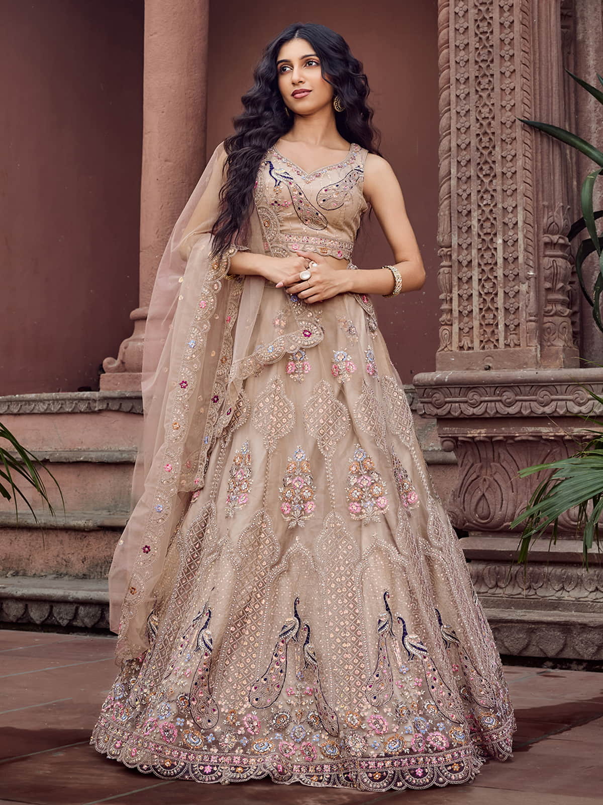 Elevate your ethnic wardrobe with this sophisticated lehenga ensemble crafted from delicate beige net fabric. The semi-stitched lehenga features intricate sequin embroidery that catches light beautifully, while the unstitched blouse allows for personalized tailoring to your exact measurements. Complemented by a coordinating dupatta, this three-piece set offers the perfect balance of traditional elegance and contemporary styling. Ideal for weddings, celebrations, and special occasions where refined craftsmanship meets timeless appeal.