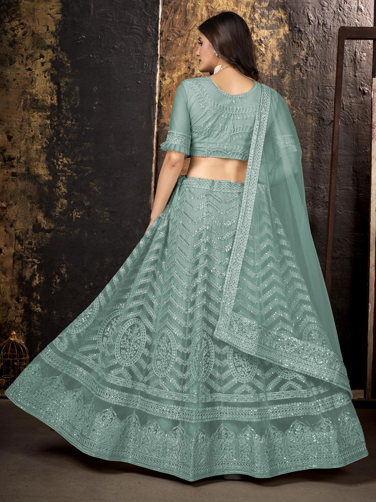 This exquisite blue lehenga set features an intricately embroidered, sequinned semi-stitched lehenga with a flared hem for graceful movement. The unstitched blouse showcases detailed embroidery, a classic round neck, and short sleeves, allowing for a tailored fit. Complemented by a matching blue embellished dupatta with a refined taping border, this ensemble combines elegant craftsmanship with versatile customization for a polished, sophisticated look.