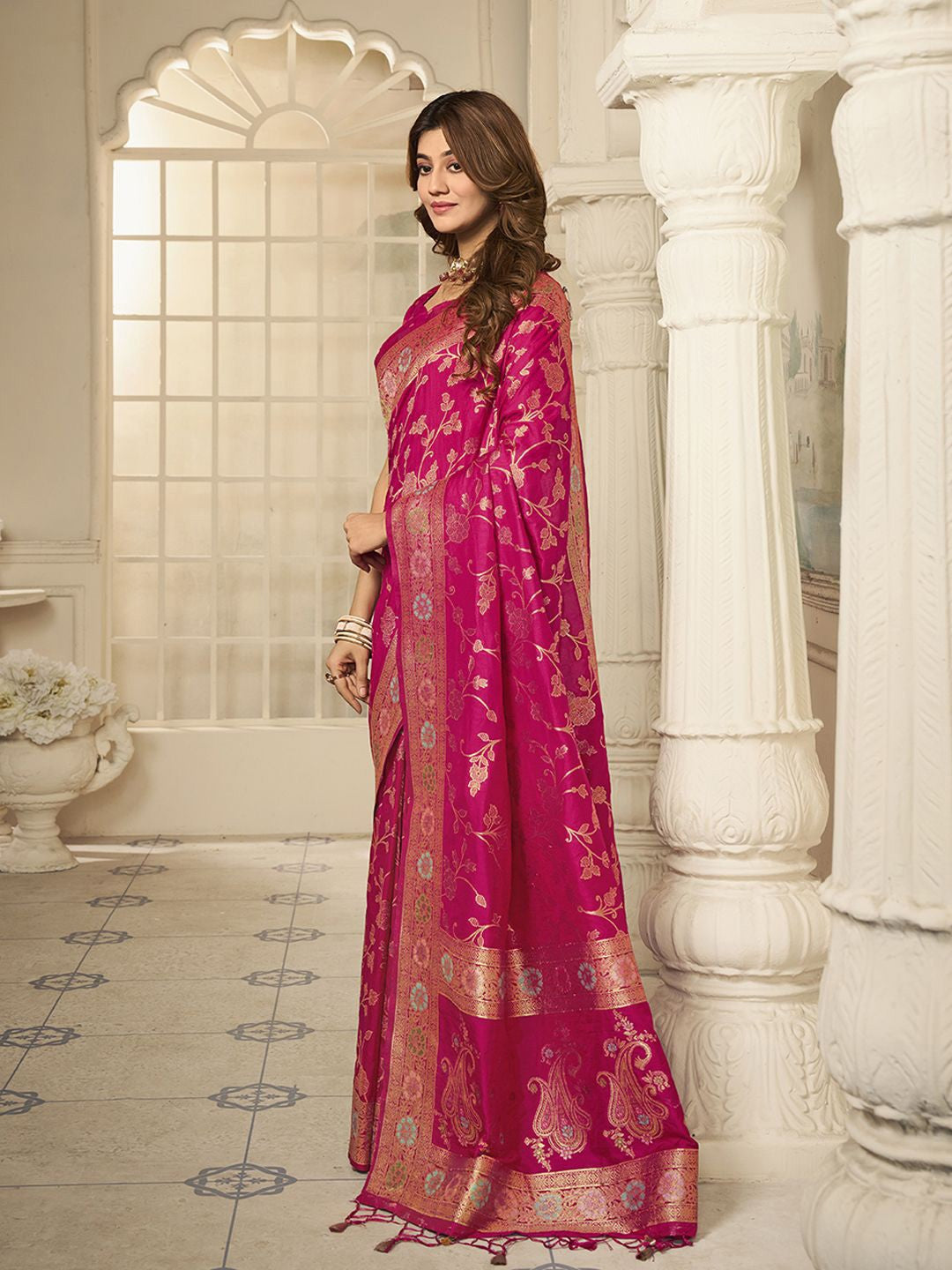 This magenta and gold-toned saree features a beautifully woven design with a matching border. The zari detailing adds an elegant touch to the traditional saree. Comes with an unstitched blouse piece, perfect for custom fitting. The model's blouse is for display purposes only. Please refer to the image for the actual design.