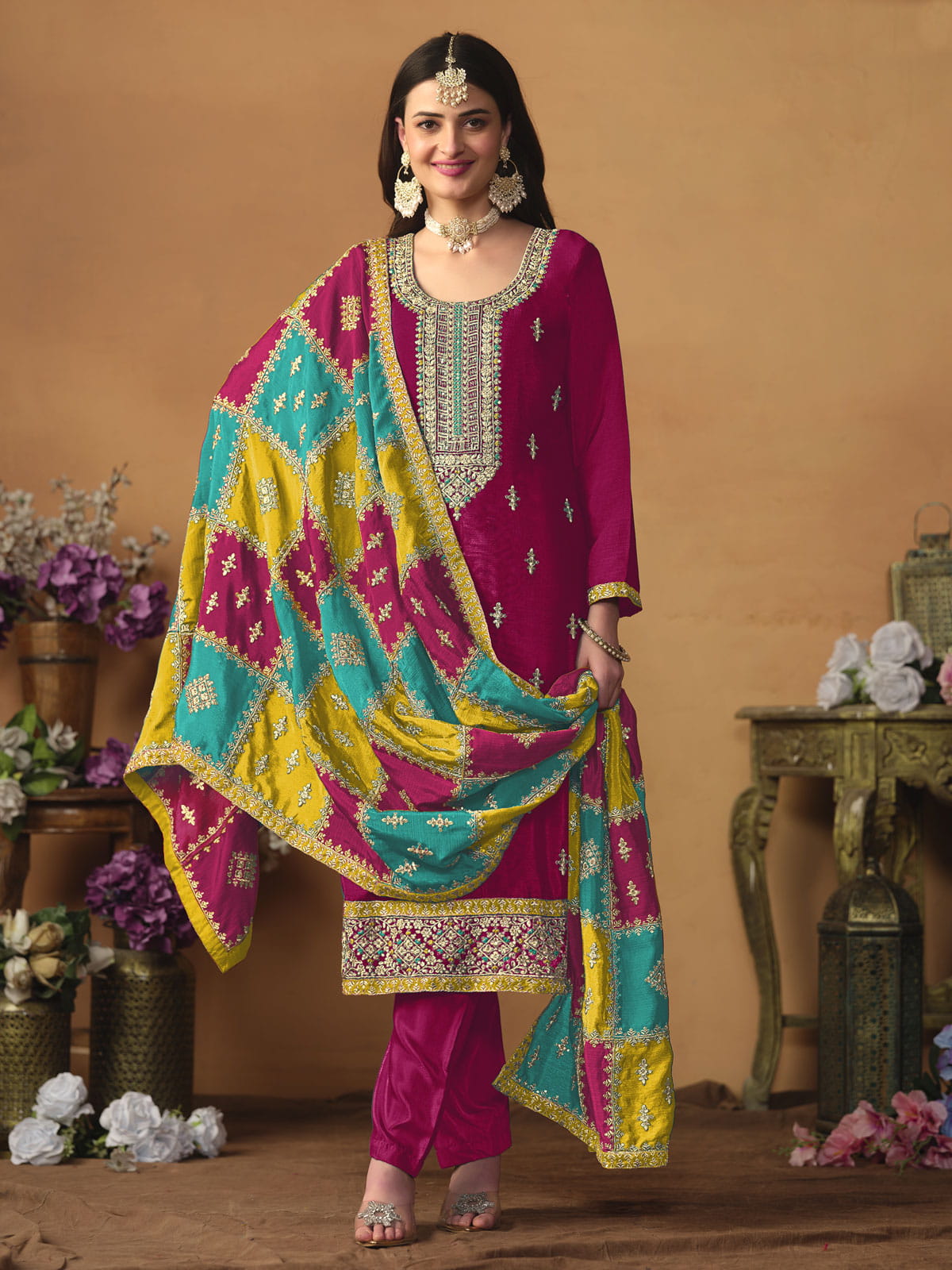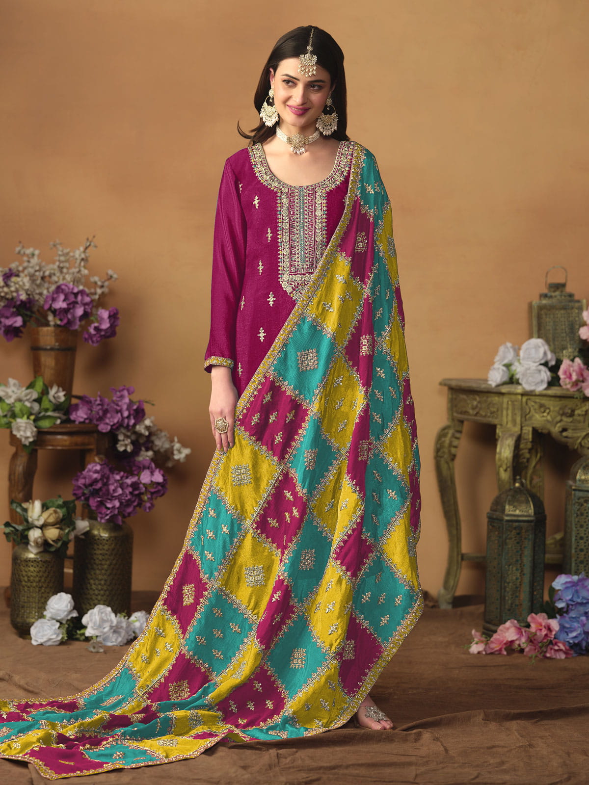 Elevate your festive look with our mystical magenta embroidered straight-cut-suit. Made of high-quality chinon silk, this subtle suit enhances your style with intricate embroidery details. Comes with santoon bottom and chinon silk dupatta. Available at the best shopping price.