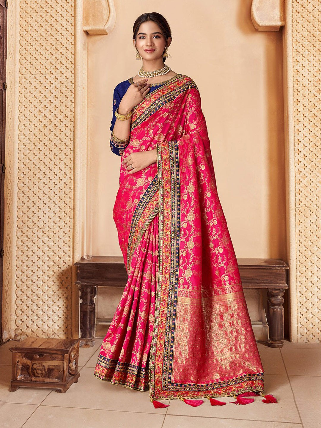 This magenta ethnic saree features a woven design with a decorative border and intricate embroidery. The saree comes with an unstitched blouse piece, offering versatility and the ability to create your own unique look. The included image of the actual blouse piece allows for ease of reference and accurate garment measurements.