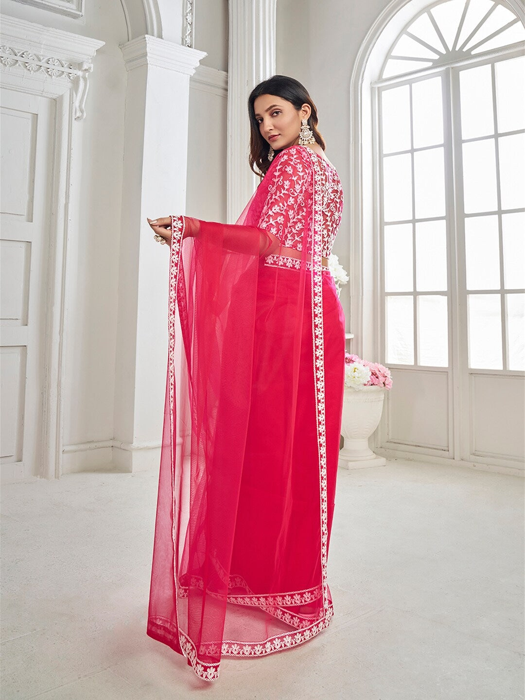 This elegant Magenta Floral Embroidered Net Saree features a beautiful combination of magenta and white, with intricate floral embroidery and a delicate embroidered border. The saree also includes an unstitched blouse piece, allowing for versatile styling options. Complete your look with the included blouse piece, or use the image as a reference for your own customized design. Expertly crafted for a sophisticated and timeless look.
