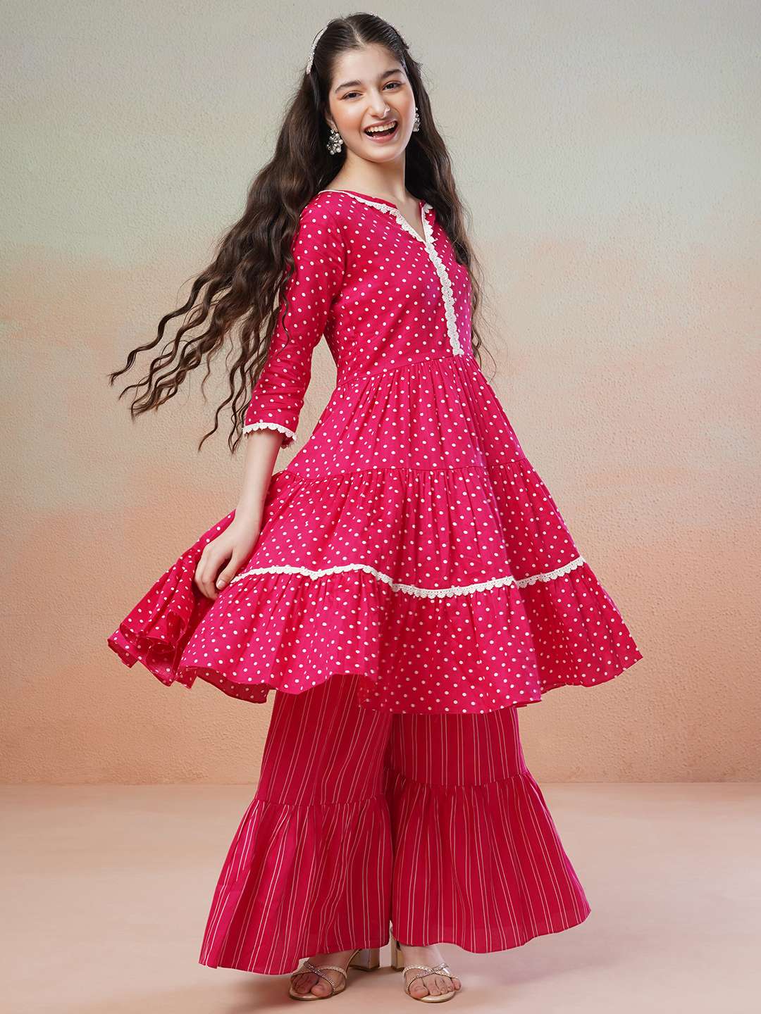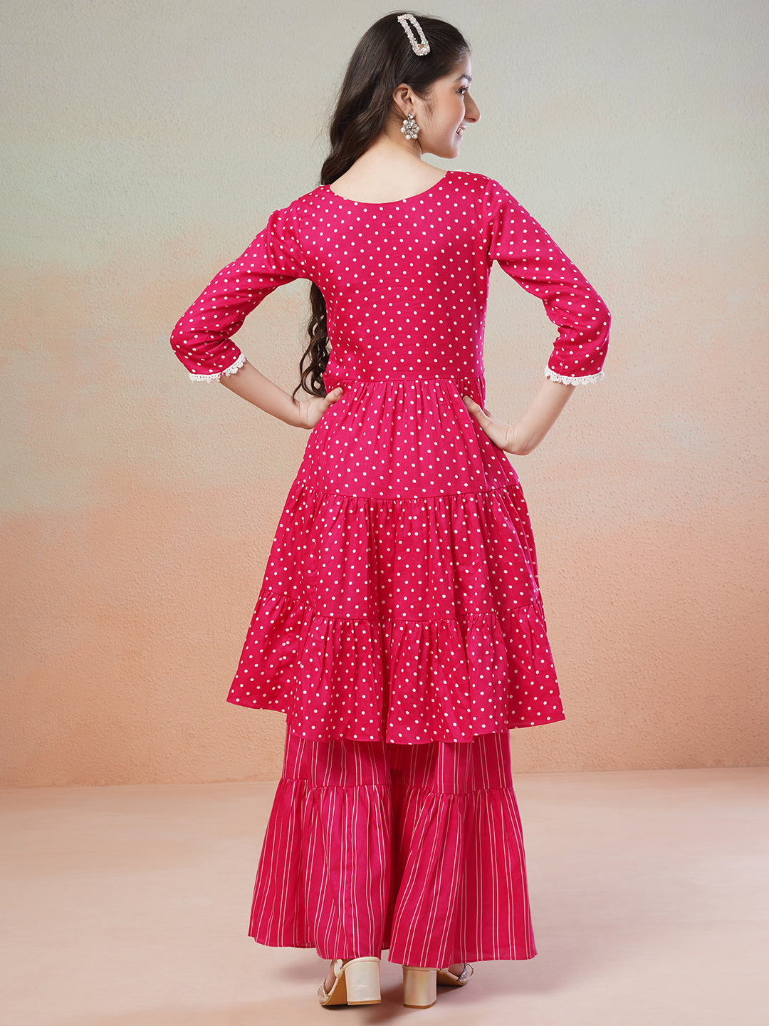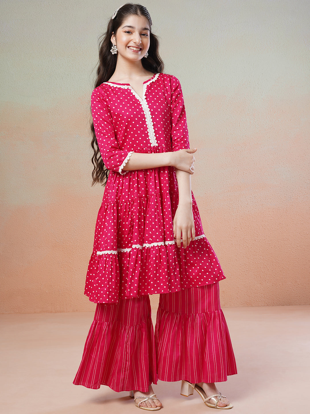 This Magenta Girls Printed Regular Kurta with Sharara features a unique geometric print and A-line shape that is both stylish and comfortable. Made from a high-quality cotton blend fabric, this kurta has a regular fit with a round neck and short sleeves. The slip-on Sharara has an elasticated waistband for easy wear, making this the perfect outfit for any occasion.
