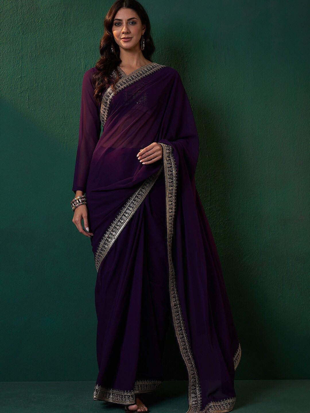 This magenta saree features a solid design with an embroidered border and sparkling sequins, adding a touch of elegance to your wardrobe. The unstitched blouse piece allows for customization, making it a versatile addition to any collection. The actual blouse piece may differ from the one worn by the model, please refer to the image for accuracy.