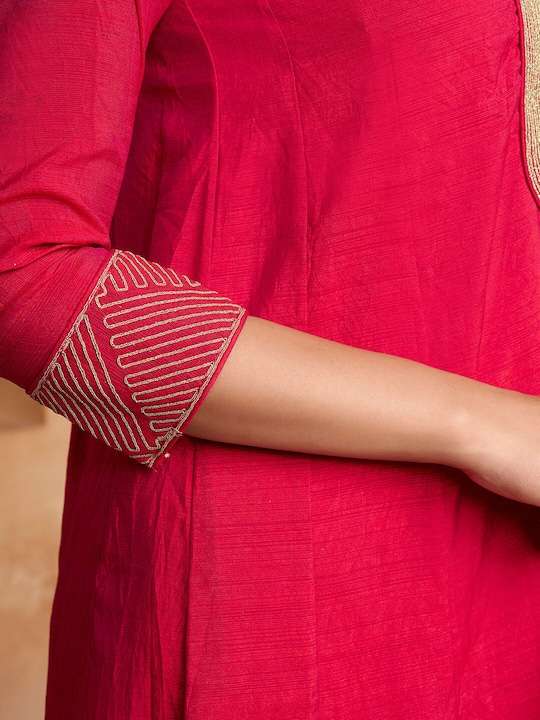 This magenta kurta set features a unique striped yoke design, complemented by an A-line shape and flared hem for a flattering silhouette. The regular style, round neck, and three-quarter sleeves add to the comfort. The trousers are solid with a partially elasticated waistband for easy slip-on closure. Made from a luxurious silk blend fabric, this set exudes elegance. Perfect for any occasion.