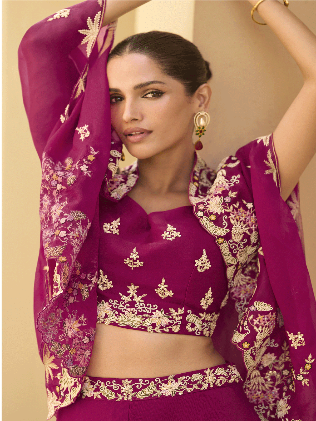 Embrace festive elegance with this striking magenta chinon indowestern ensemble, meticulously crafted for the discerning bride. Hand-embroidered with intricate thread work, shimmering beads, zardosi, and zari detailing, each piece reflects exceptional artisanal craftsmanship. The softly rounded U-neckline gracefully frames the shoulders while the sleeveless silhouette maintains contemporary sophistication. The coordinating cape features richly embroidered motifs that create dynamic movement and a luxurious layered aesthetic, elevating your wedding day presence with timeless grandeur and modern sensibility.