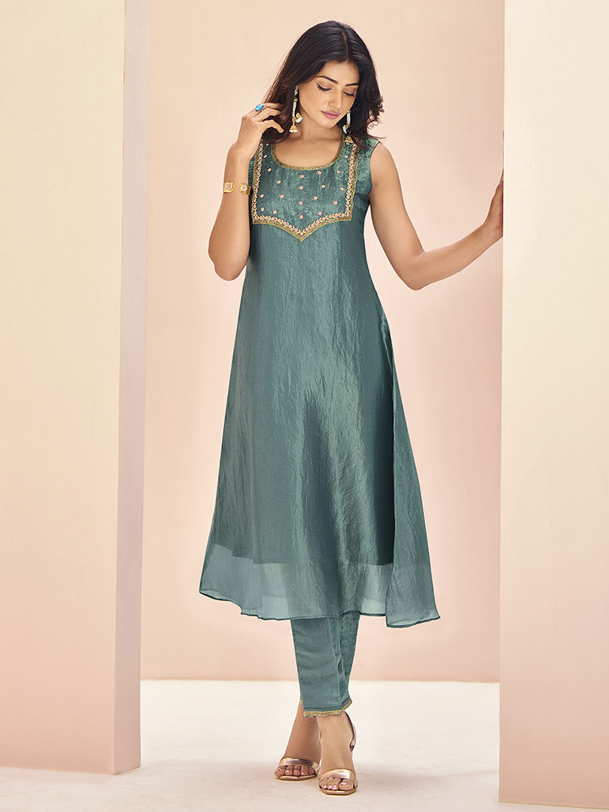 Make a statement at any event with our stunning "Magnetic Aqua Blue Embroidered Organza Event Wear Pant Suit". This fully stitched ensemble features intricate embroidery on high-quality organza fabric, offering a classy and elegant look. Available in sizes S to XXL, it includes a matching pant for a cohesive outfit. Pair with your favorite accessories for a unique and confident style.