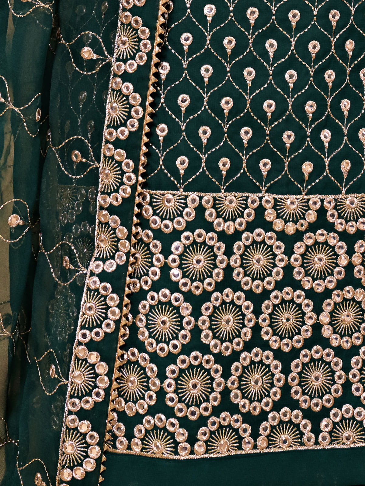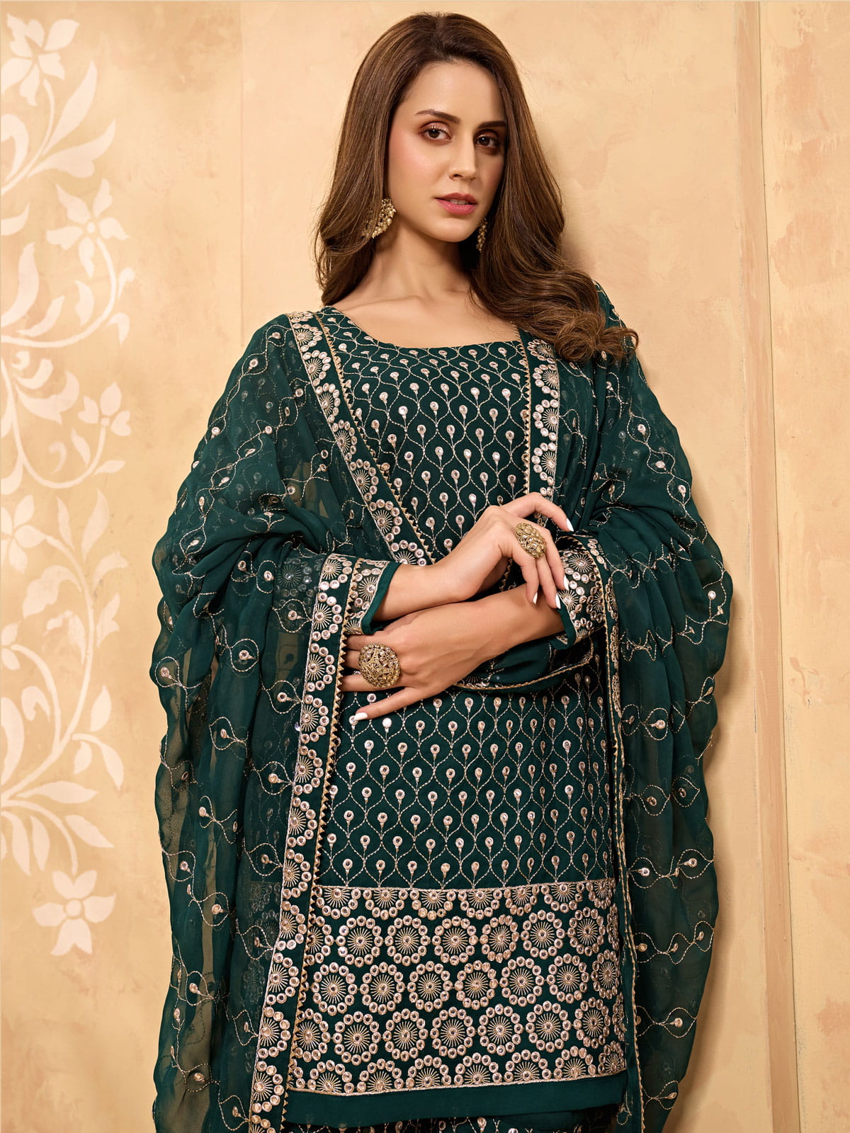 As an industry expert, the Majestic Green Mirror Embroidered Georgette Sharara Suit is a must-have for those seeking elegance and style in their ethnic wear. This Indian outfit features exquisite embroidery with zari, stone, and mirror work, along with a beautiful straight cut georgette top, embellished sharara bottom, and mirrorwork detailed dupatta. Make a statement with this stunning set and complete the look with golden earrings and heels.