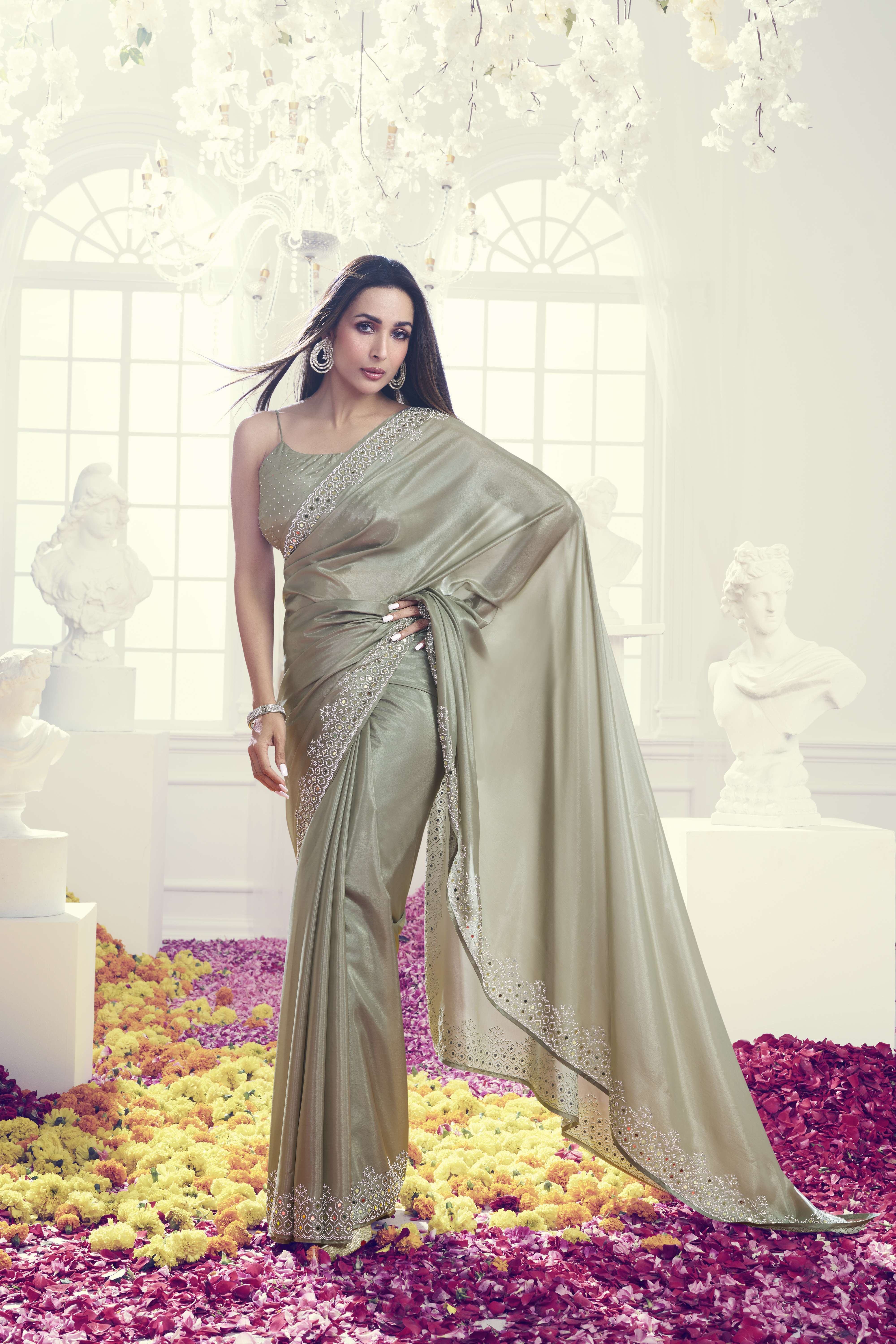 The Malaika Arora Embellished Mirror Work Satin Saree adds a touch of elegance with its silver and gold tones. The intricate embroidery and mirror work detailing showcases expert craftsmanship. Made from high-quality satin, this saree is perfect for special occasions. Dry clean for long-lasting wear.