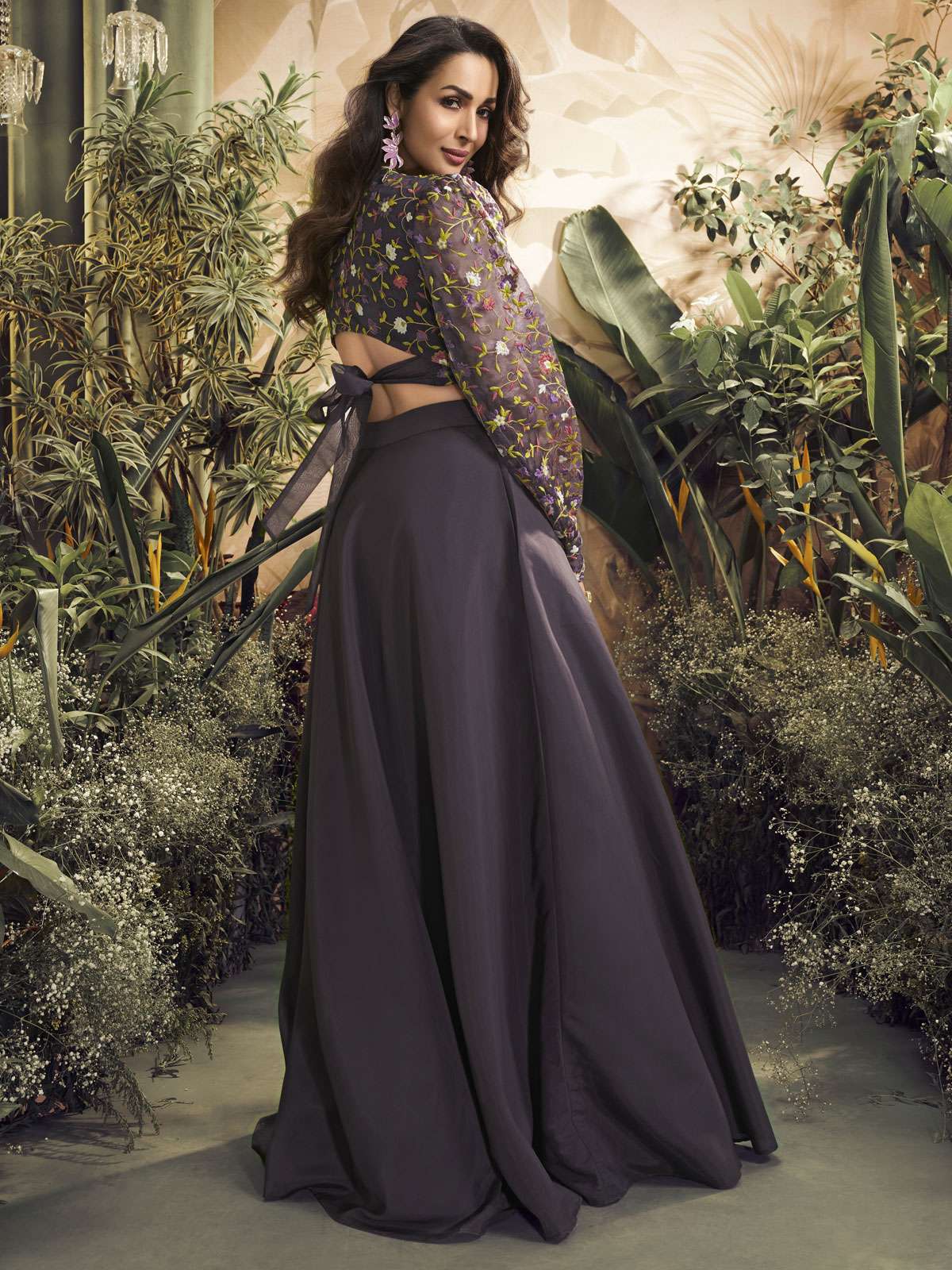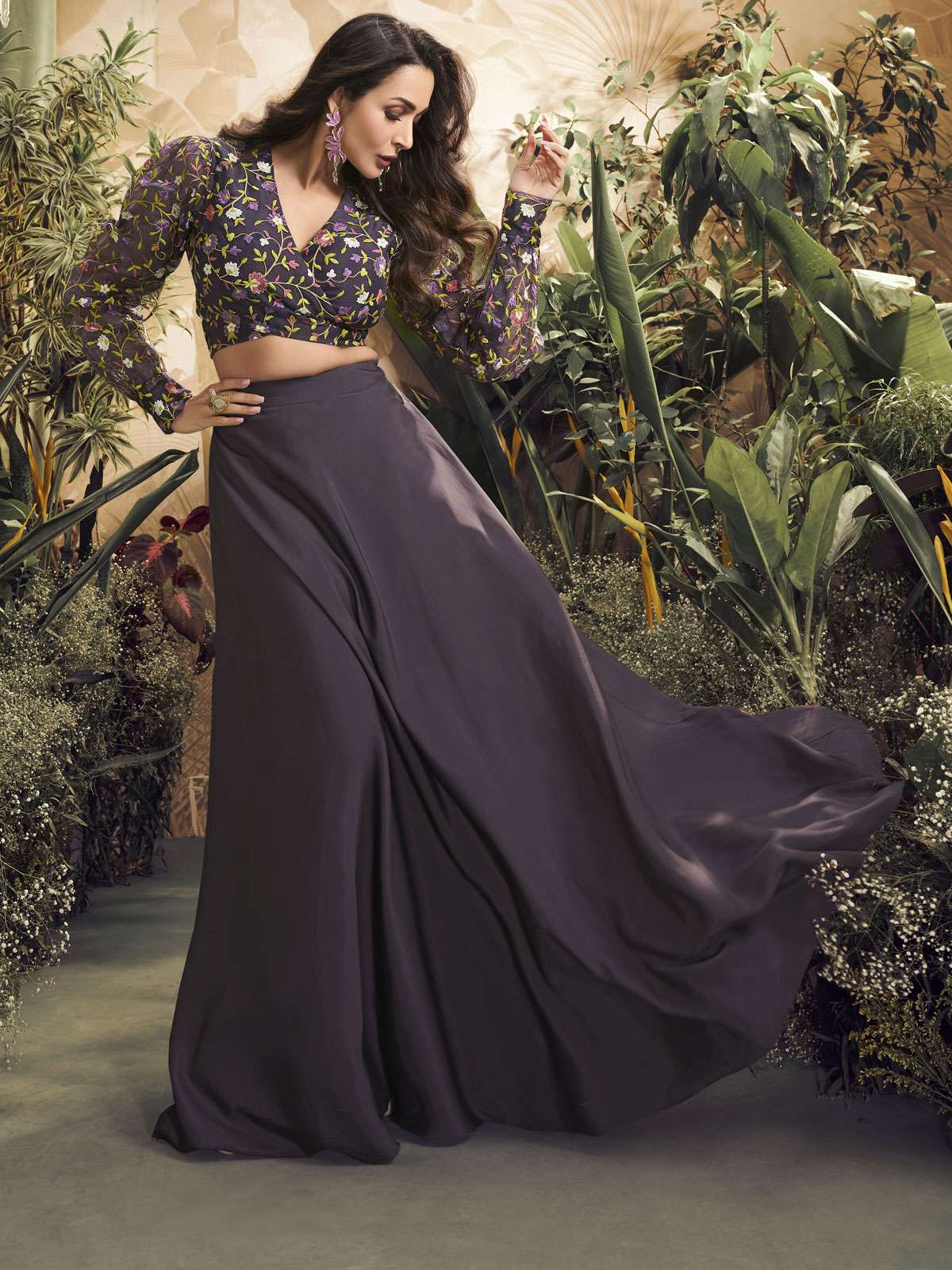 Experience elegance and sophistication with our Malaika Arora Embroidered Tie-Up Top with Flared Skirt Co-Ord Set. The mauve floral embroidered top boasts a V-neck and puff sleeves, while the regular waist hem and back tie-up closure add a touch of femininity. Paired with a mauve solid mid-rise flared skirt, featuring a zip closure and flared hem, this co-ord set is perfect for any occasion. Made of organza and viscose silk, this set exudes luxury and style. Dry clean only.