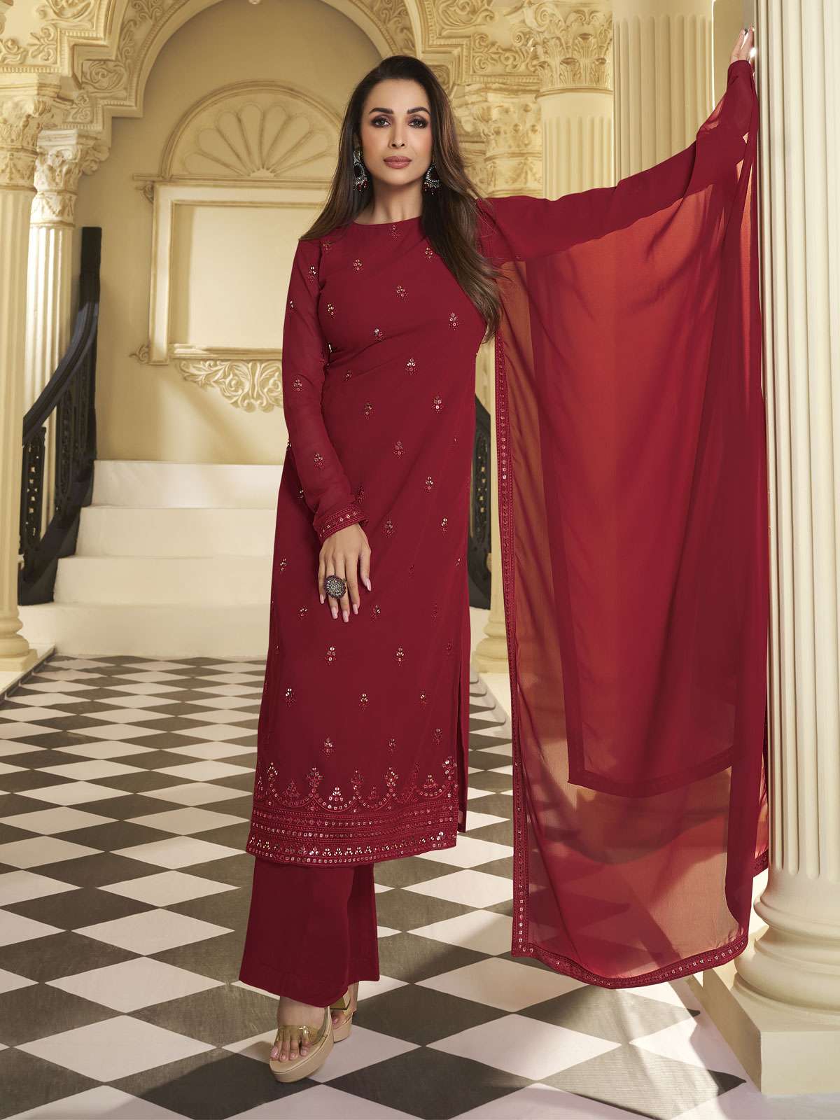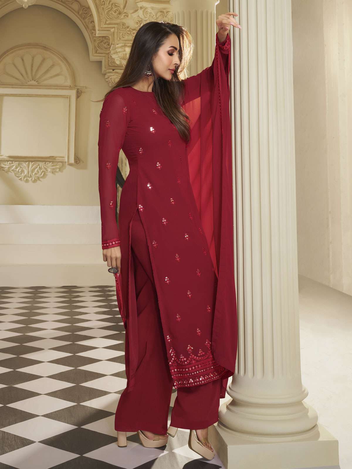 Elevate your ethnic wardrobe with this stunning kurta set from Malaika Arora. The intricately embroidered ethnic motifs add a touch of elegance to the straight shape and regular style of the kurta. The sequinned detail and calf length hemline add subtle shimmer to the georgette fabric. The solid palazzos feature a partially elasticated waistband for a comfortable fit. Complete the look with the matching georgette dupatta.??